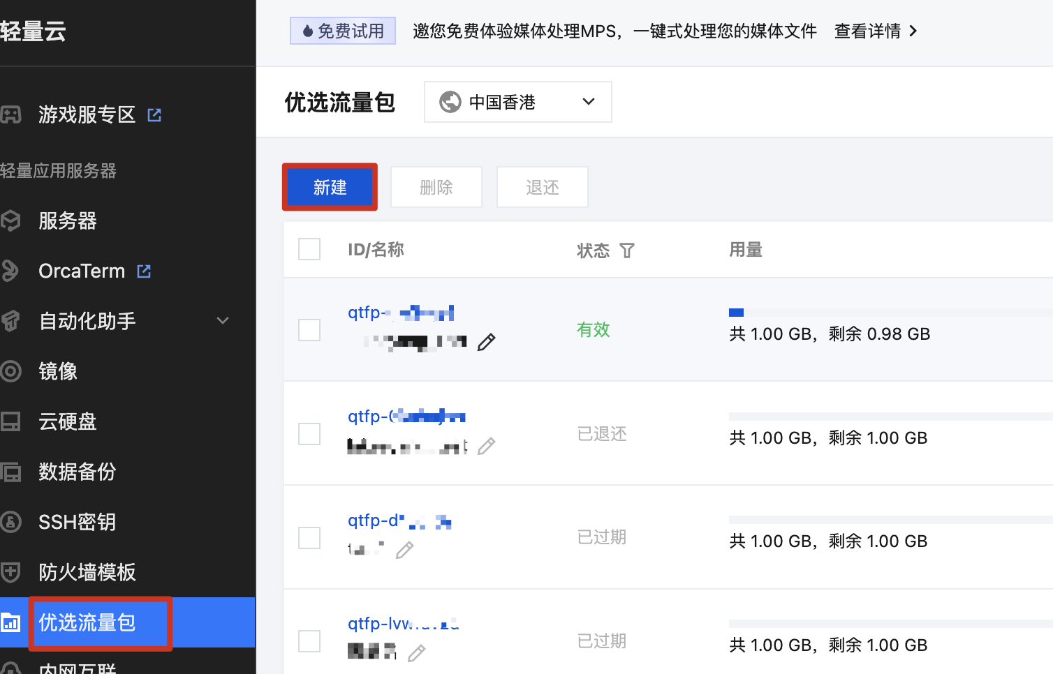 2. 在轻量优选流量包页面左上角选择地域,单击新建。