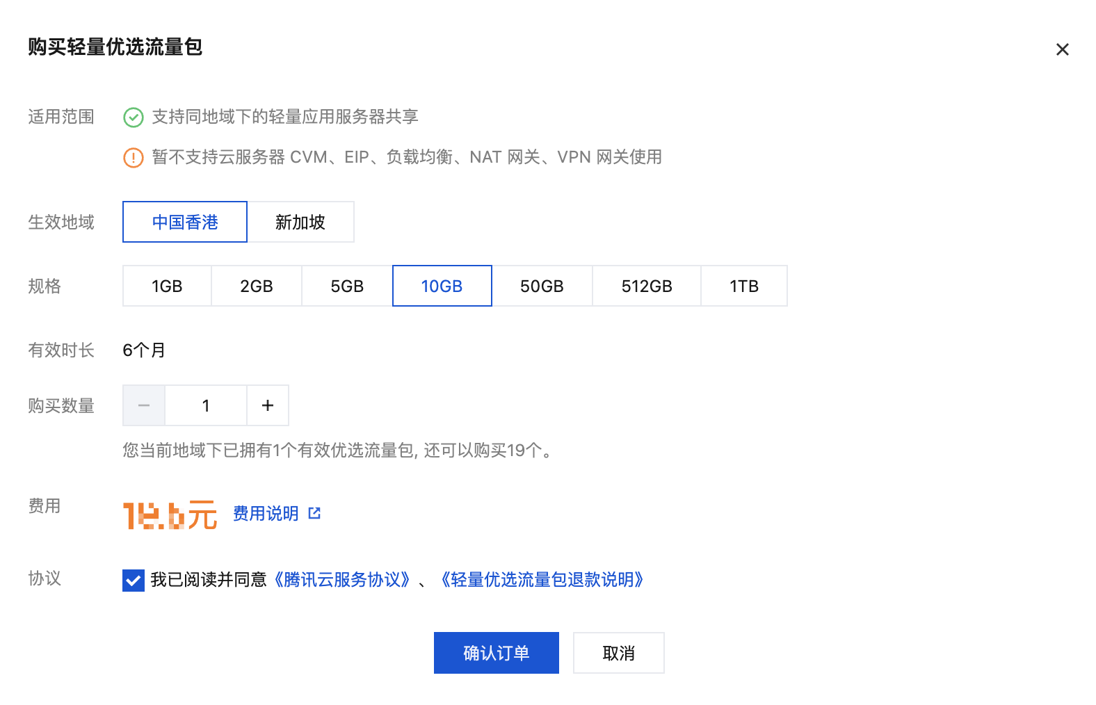 协议 | 勾选我已阅读并同意《腾讯云服务协议》、《轻量优选流量包退款说明》。 |
