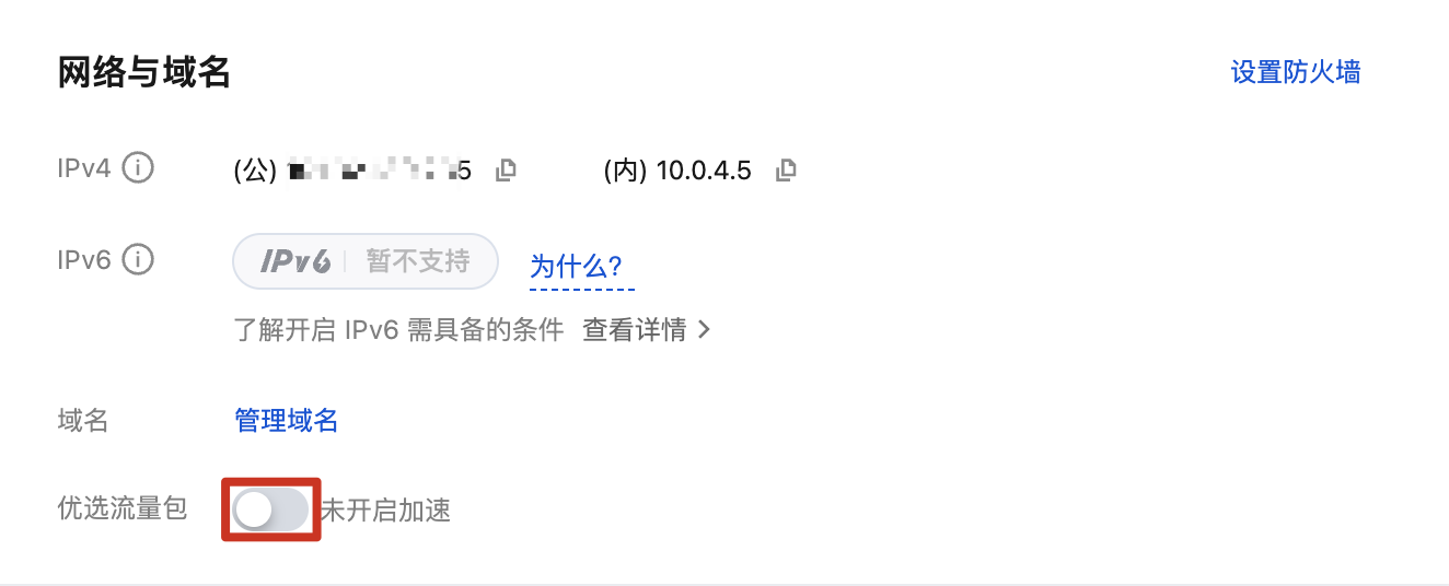 3. 在实例详情页的网络与域名模块,可看到实例上优选流量包默认是未开启加速状态,单击优选流量包的启停按钮。