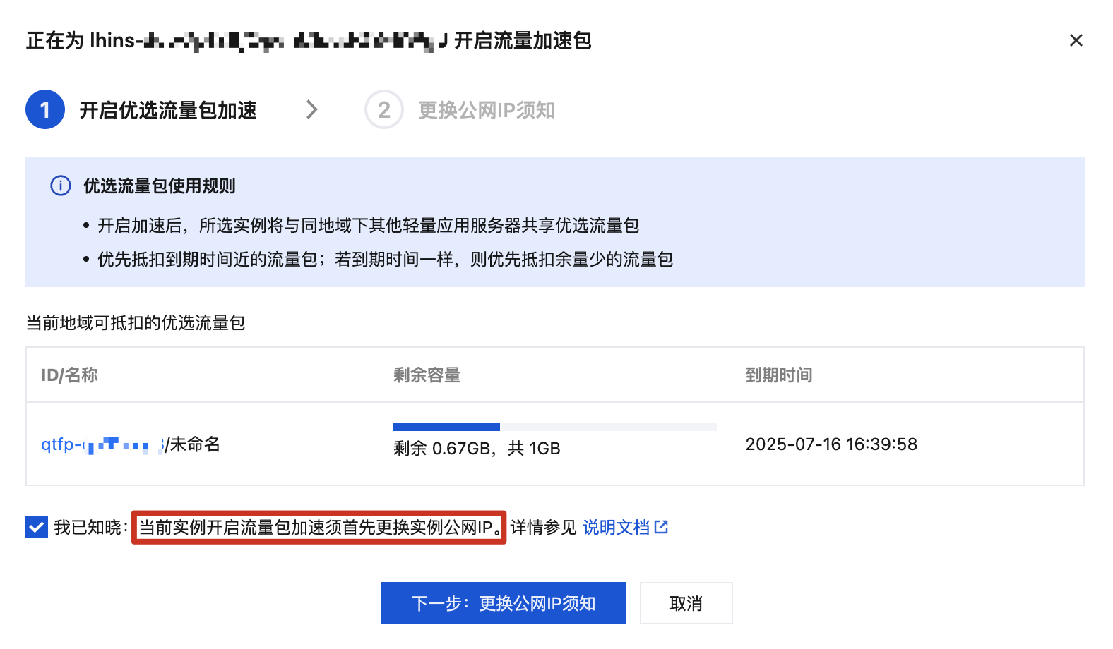 如为新加坡地域的轻量应用服务器开启流量加速包,必须首先更换实例公网 IP,更换不占用您自助更换公网 IP 的配额,请充分了解更换公网IP须知后再操作。