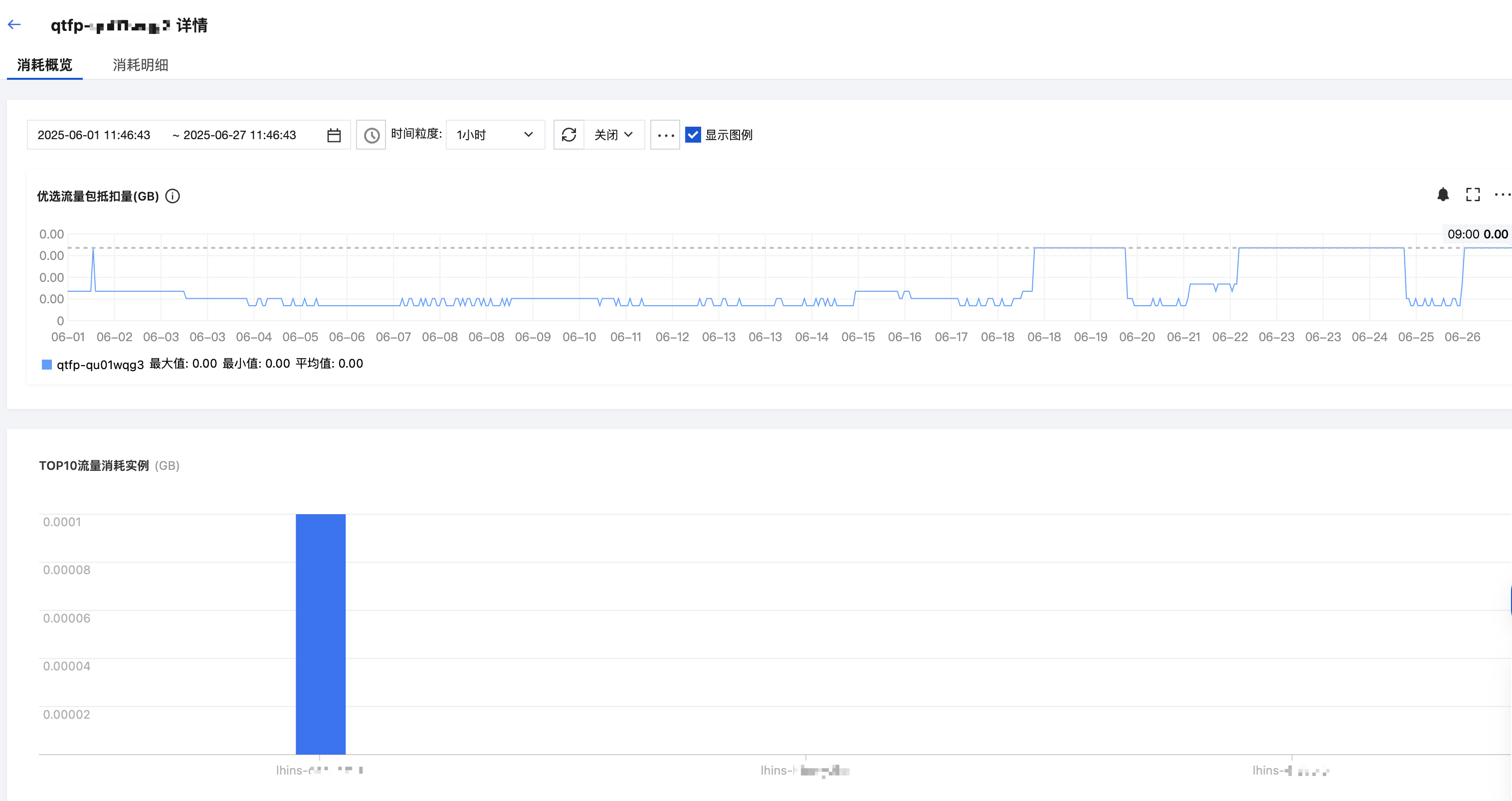 5. 在消耗概览页面,选择查看时间后,即可查看对应时间内的优选流量包的消耗量和 TOP10 流量消耗实例。