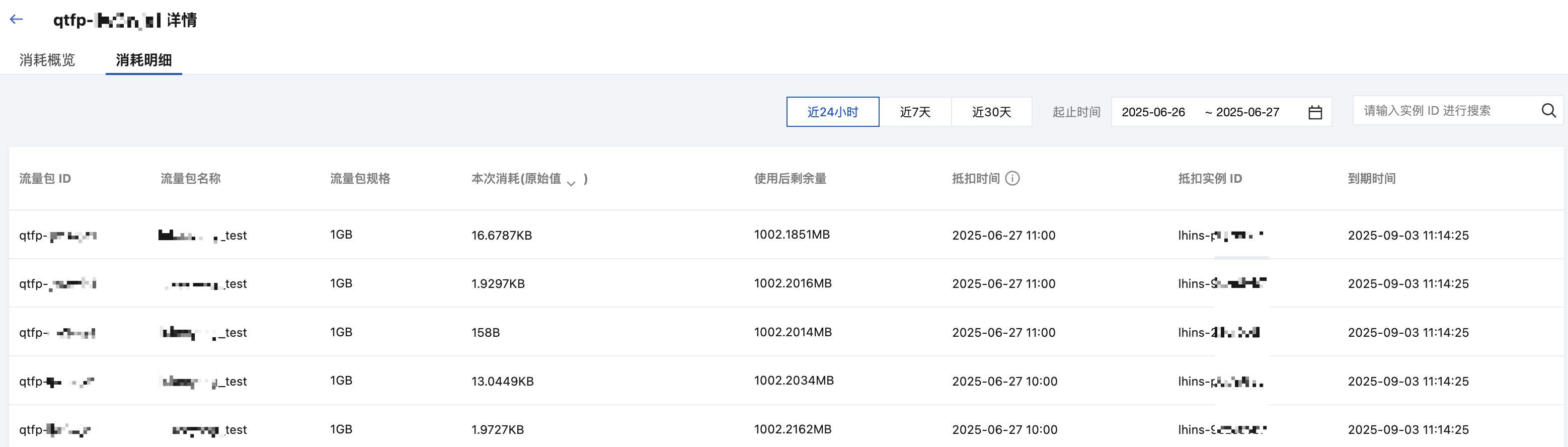 6. 单击消耗明细标签页,可查看优选流量包的消耗明细,可根据时间、抵扣实例 ID 进行查询。