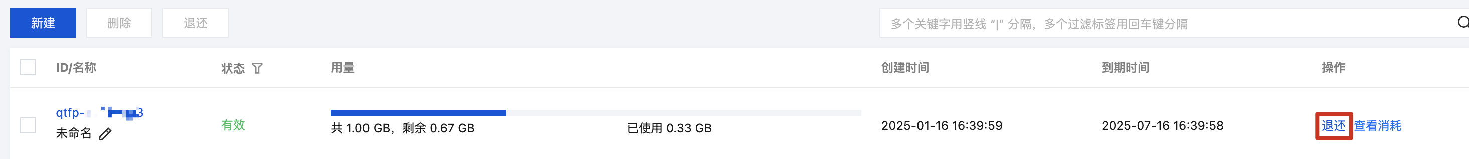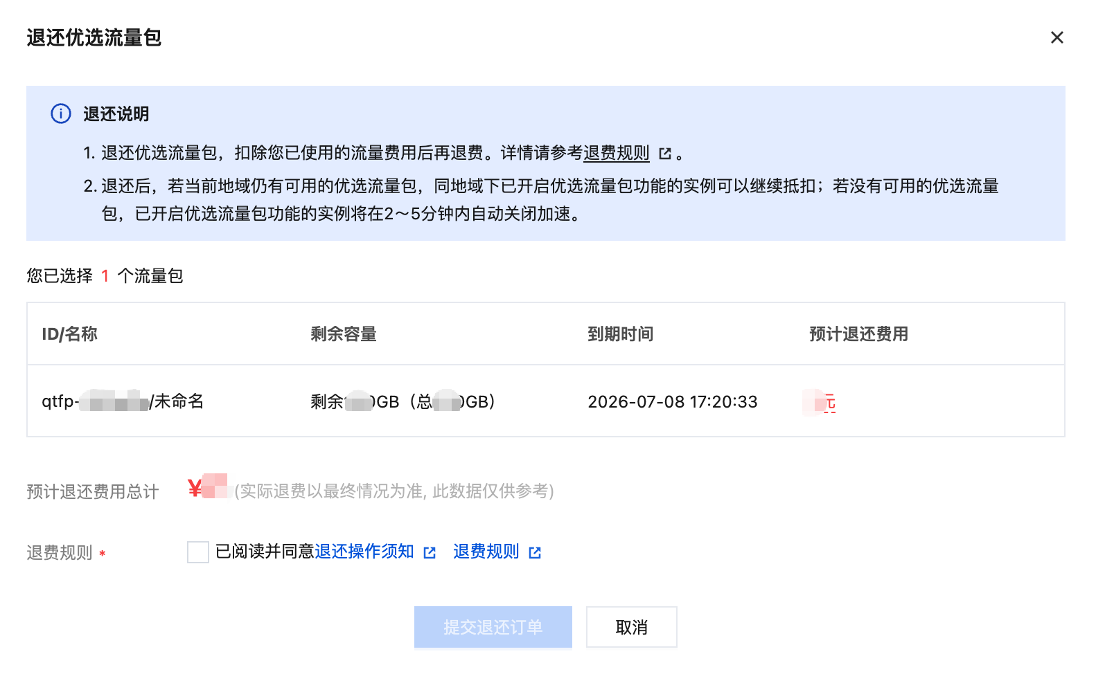 仅状态为有效(未到期)的优选流量包支持退还,您可在优选流量包列表中进行查看,具体退还规则请参见 退费说明