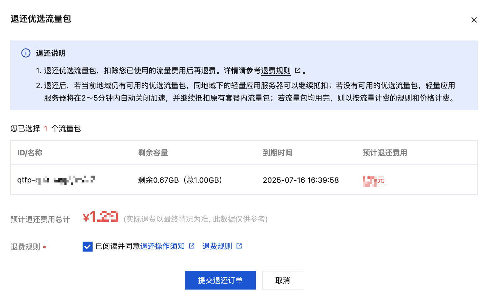2. 退还轻量优选流量包支持单个退还和批量退还: