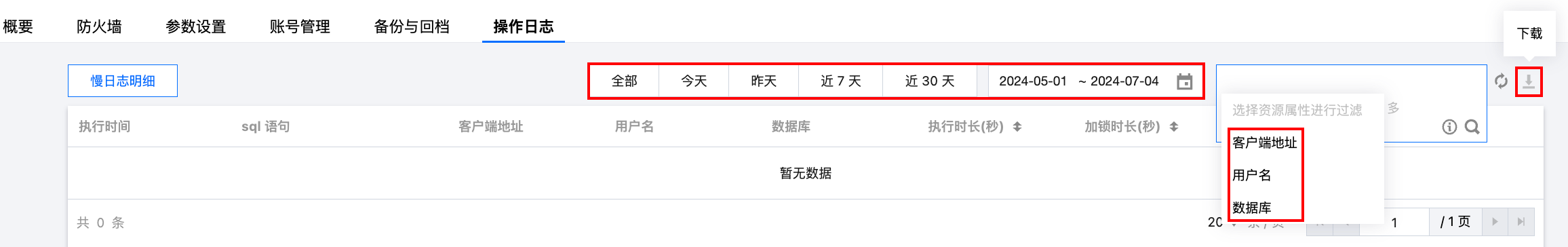 4. 列表上方可筛选查询的时间段,包括全部、今天、昨天、近7天、近30天以及自定义时间窗,可通过资源属性(客户端地址、用户名、数据库)快速过滤出对应慢日志记录,可单击下载图标,下载慢日志明细。