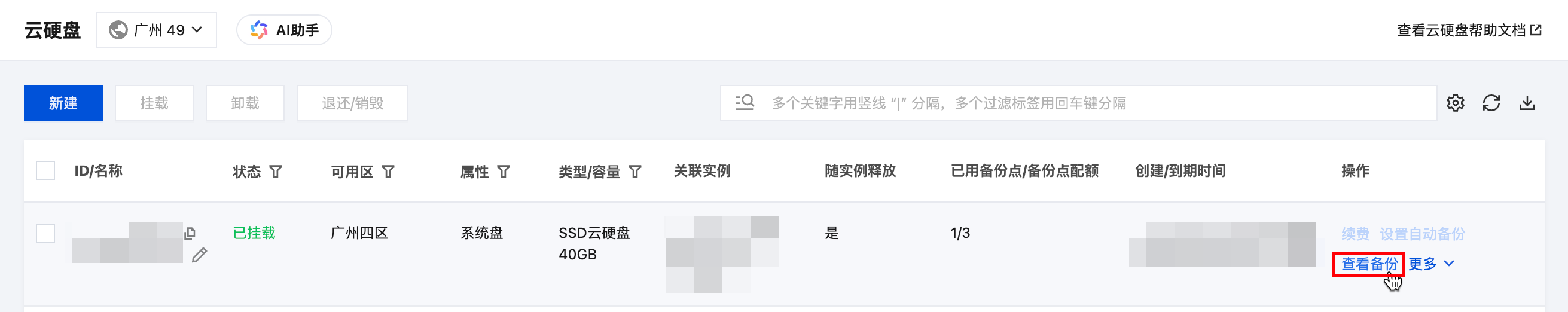 5. 后续您可以在云硬盘列表单击查看备份,来查看已经创建的数据备份。