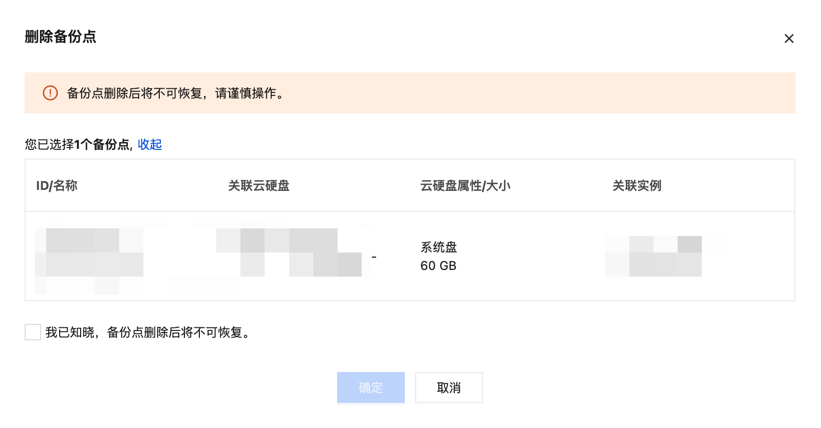 4. 在弹出的备份列表中,选择需要删除的数据备份,在操作列单击删除,在弹出的删除窗口中阅读并勾选“我已知晓,备份点删除后将不可恢复。”后,单击确定即可。如下图所示: