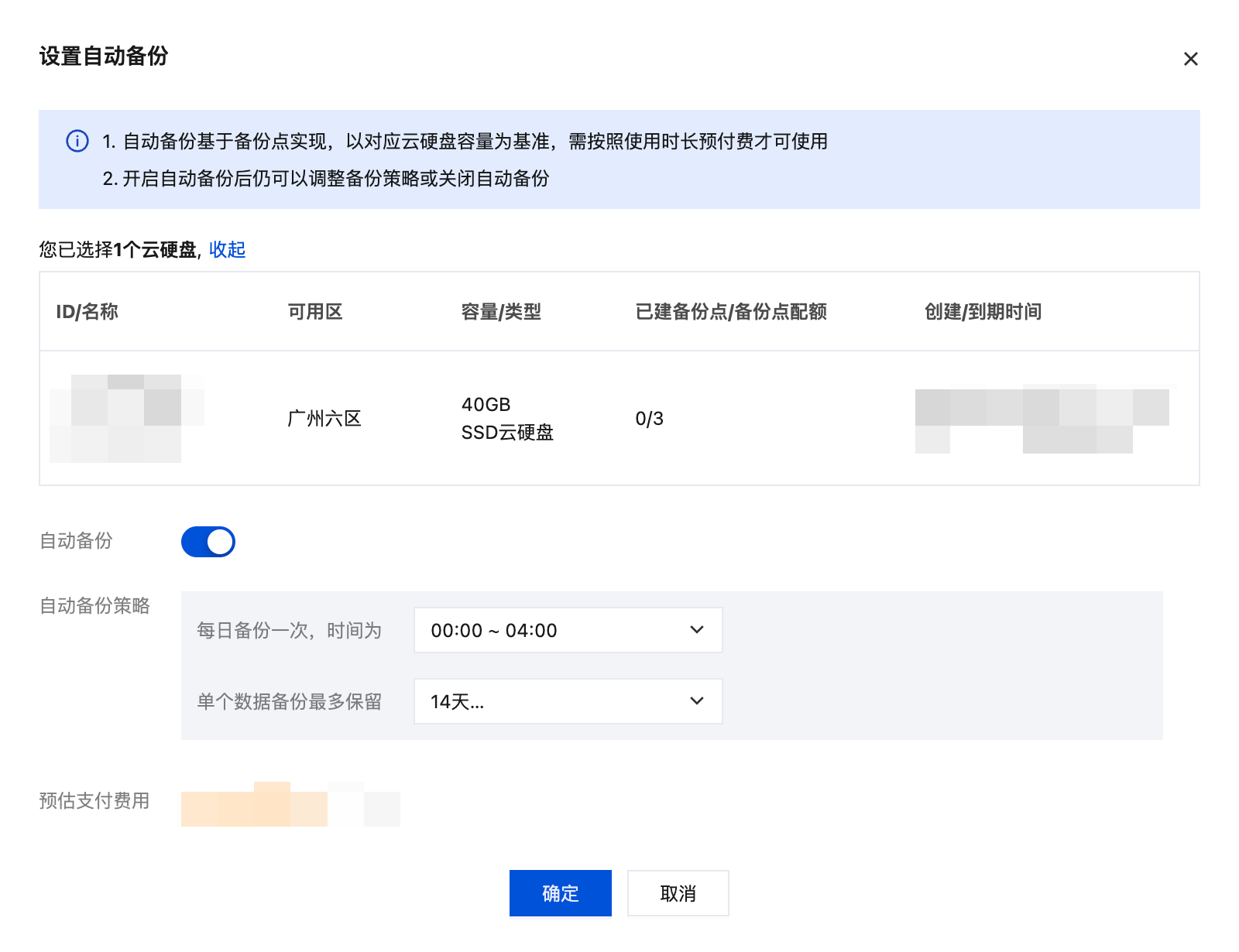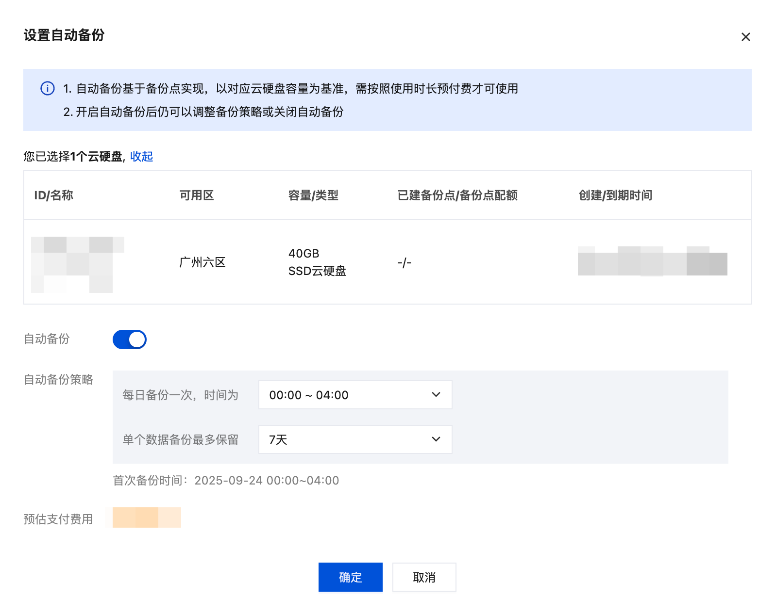 5. 确认预估支付费用后,单击确定提交订单,根据页面提示完成支付后,即已开启自动备份。