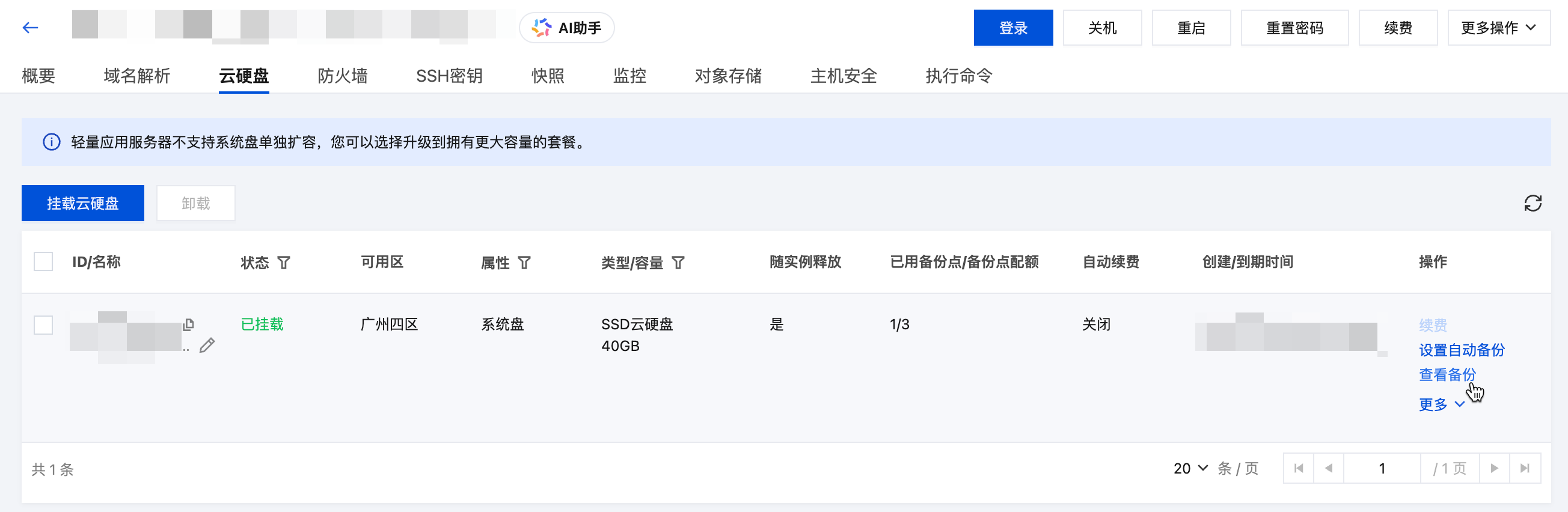 3. 您可以在该页面内找到实例系统盘,并在操作列单击查看备份。