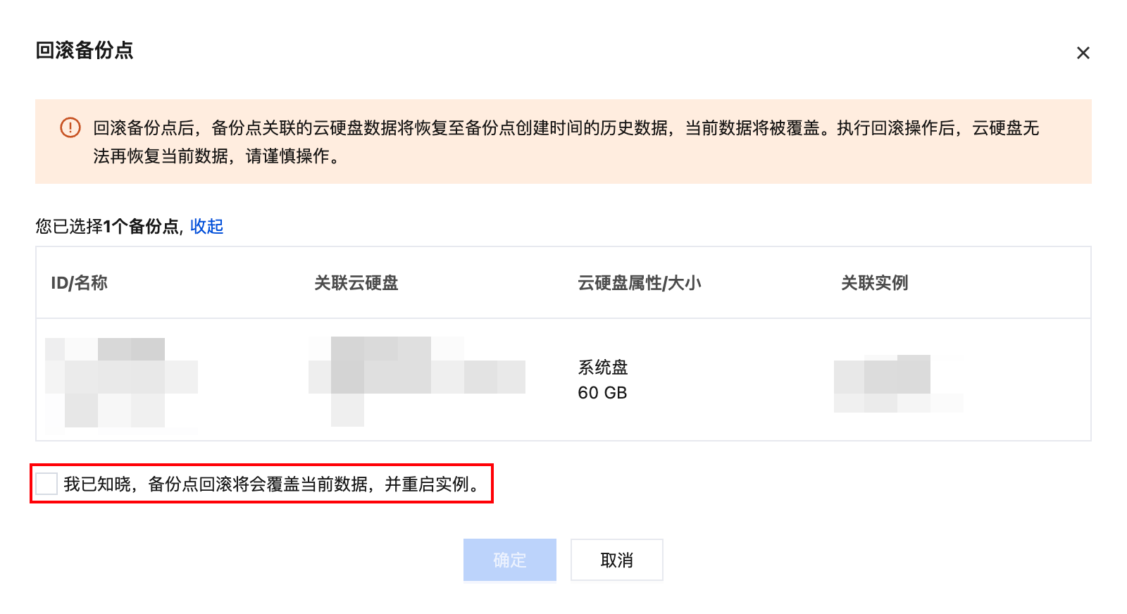 4. 在弹出的备份列表中,选择需使用的数据备份,在操作列单击回滚备份点,并在回滚弹窗中勾选“我已知晓,备份点回滚后将会覆盖当前数据,并重启实例。”后单击确定。如下图所示: