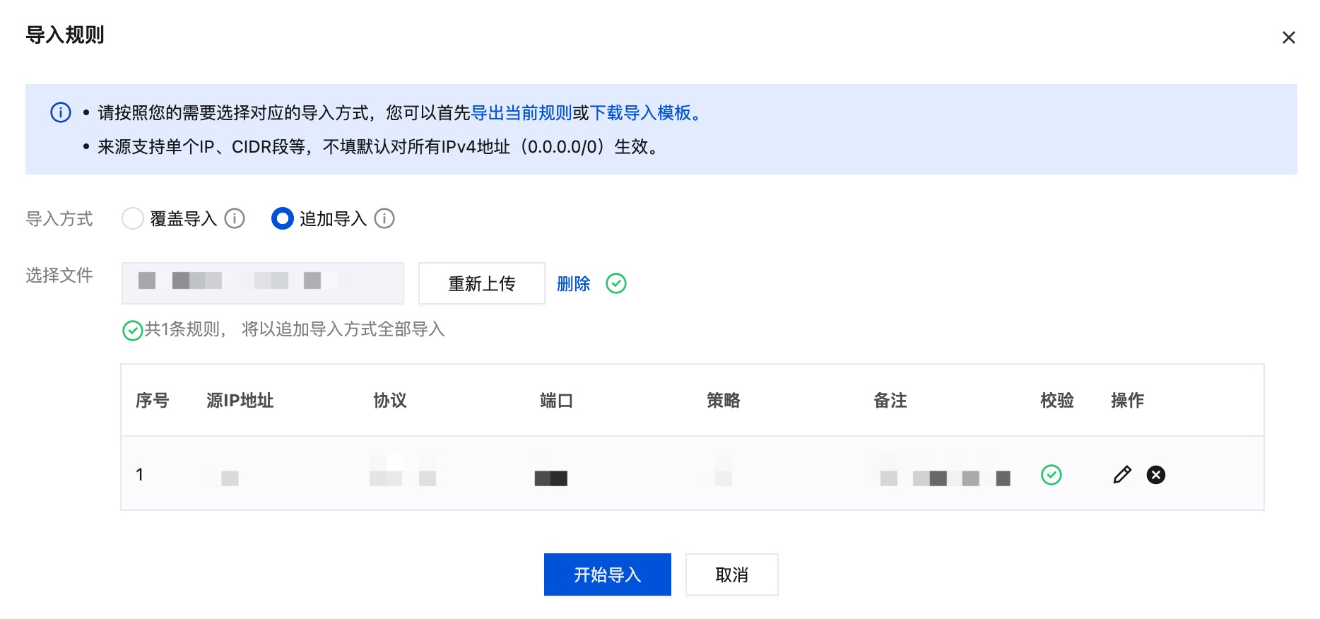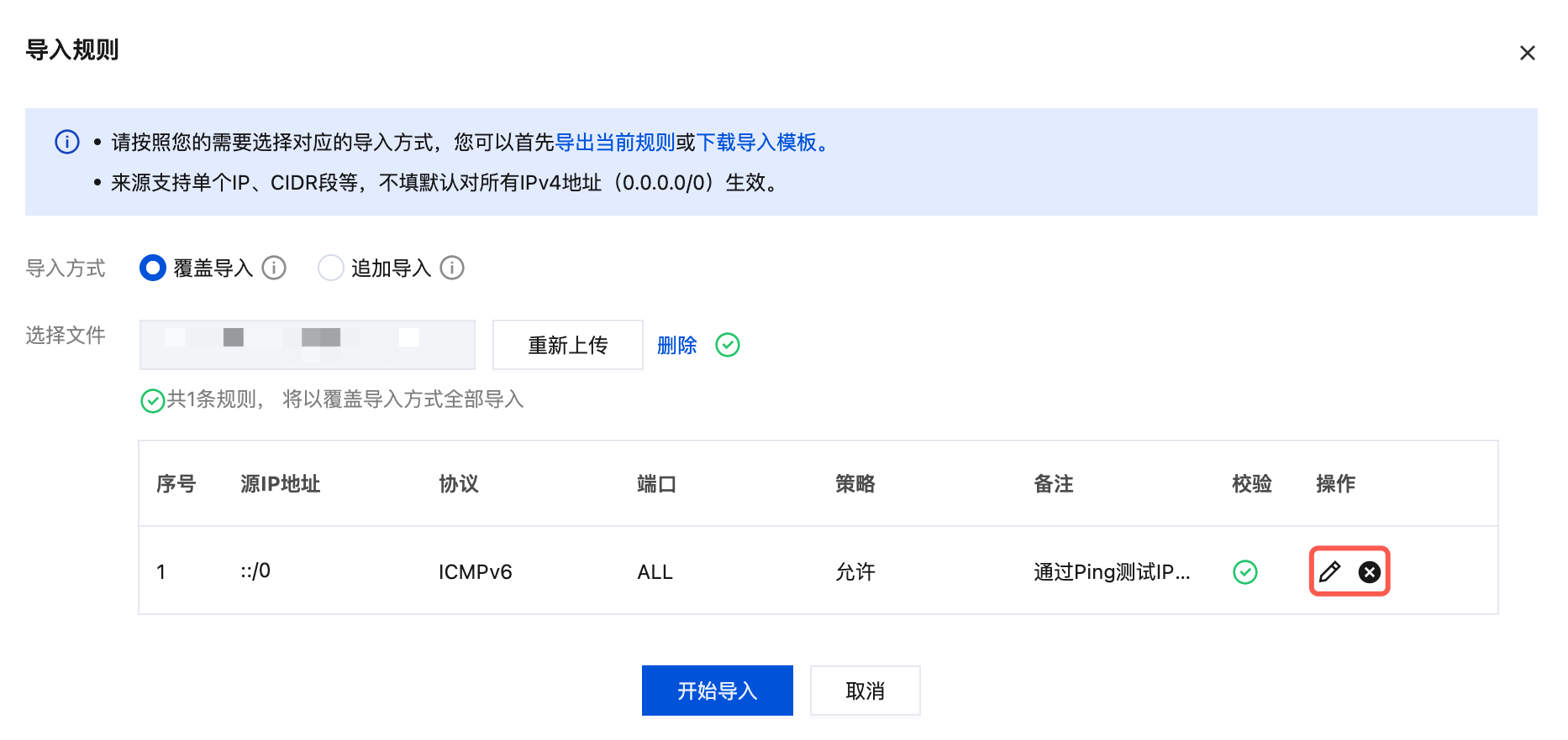 2. 上传规则文件,通过校验后,单击开始导入。