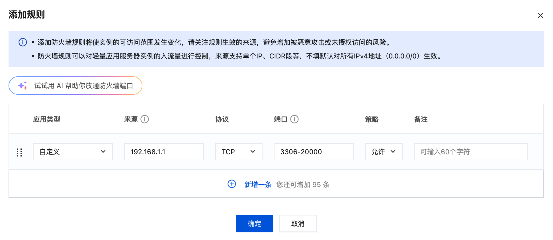 本文以添加放通来源 IP 为192.168.1.1,协议类型 TCP,端口为3306-20000的规则为例。请您结合实际情况进行操作,规则参数说明请参见 组成部分。注意: