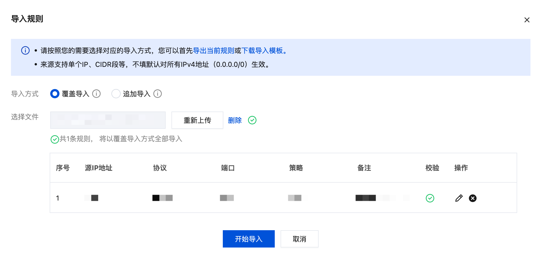 覆盖导入规则:选择文件中的规则将覆盖防火墙模板的原有规则。