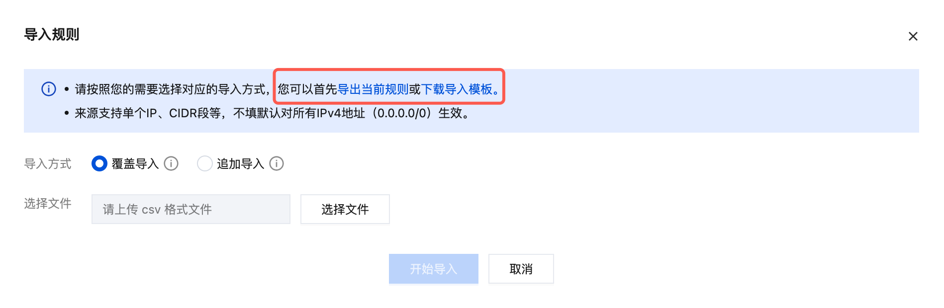 您可以在导入规则的弹窗中选择导出当前规则或下载导入模板。