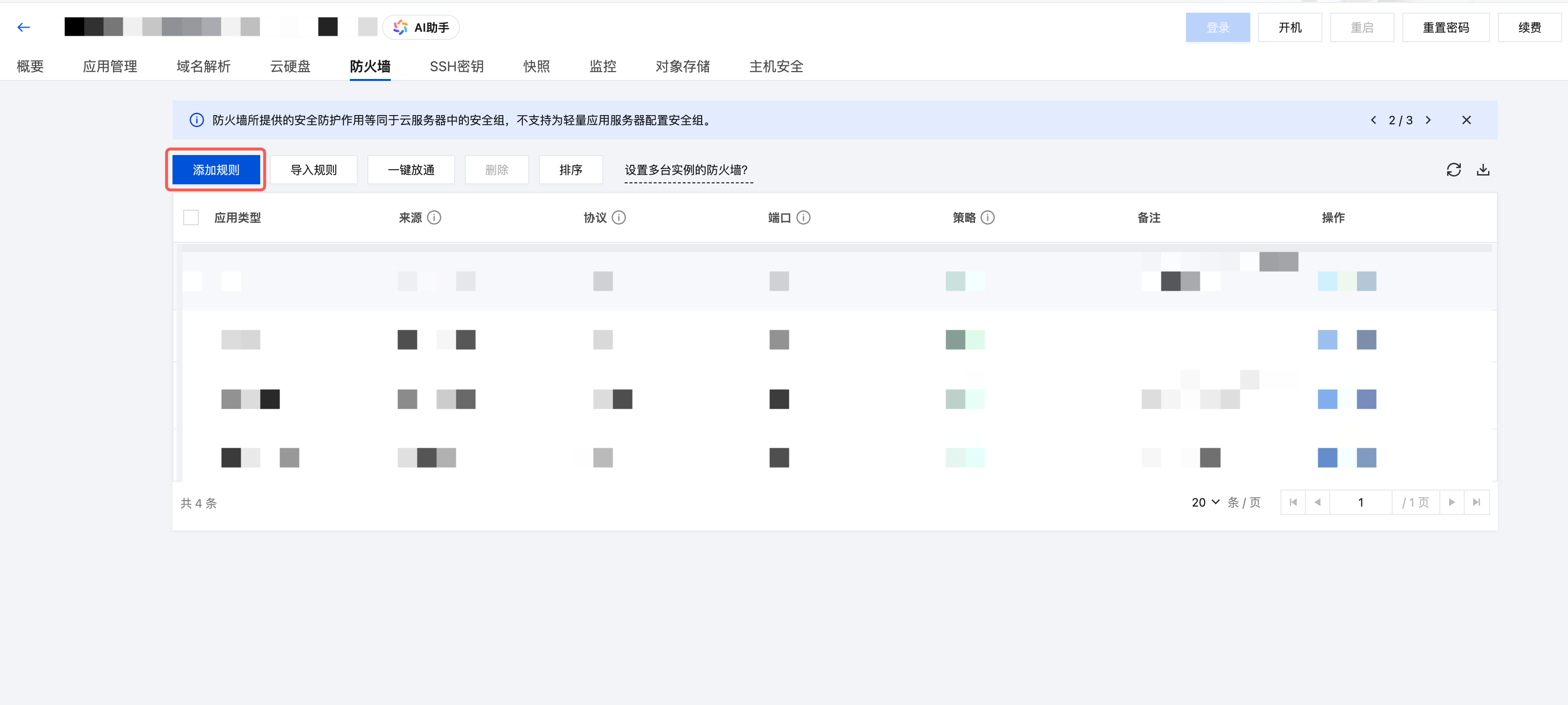 2. 在实例详情页中,选择防火墙页签,并单击添加规则。如下图所示: