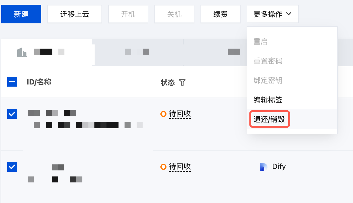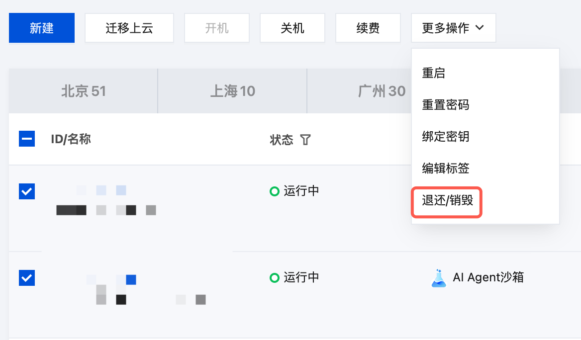 在列表视图中,支持批量退还同地域的多台实例,勾选某地域下需退还的实例后,选择页面上方的更多操作 > 退还/销毁。如下图所示: