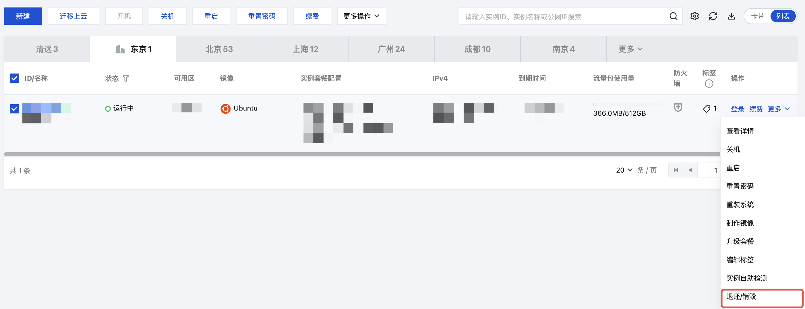 在列表视图中,支持批量销毁同地域的多台实例,勾选某地域下需销毁的实例后,选择页面上方的更多操作 > 退还/销毁。如下图所示: