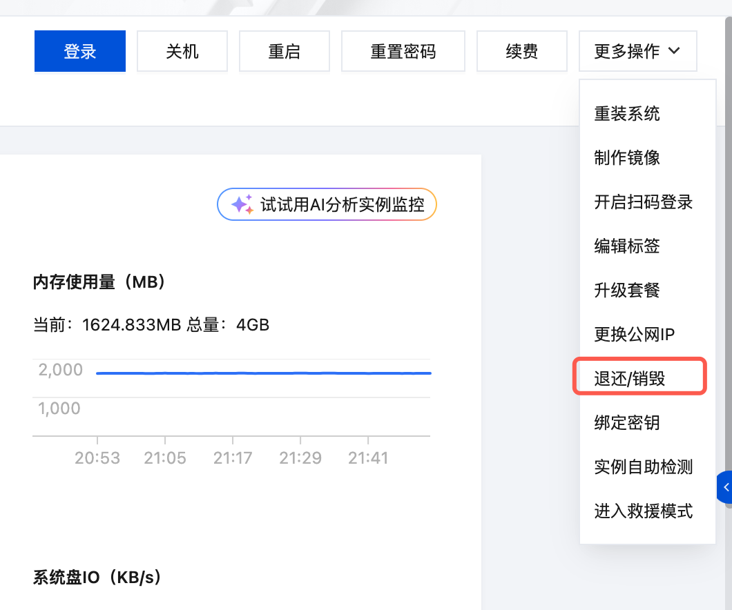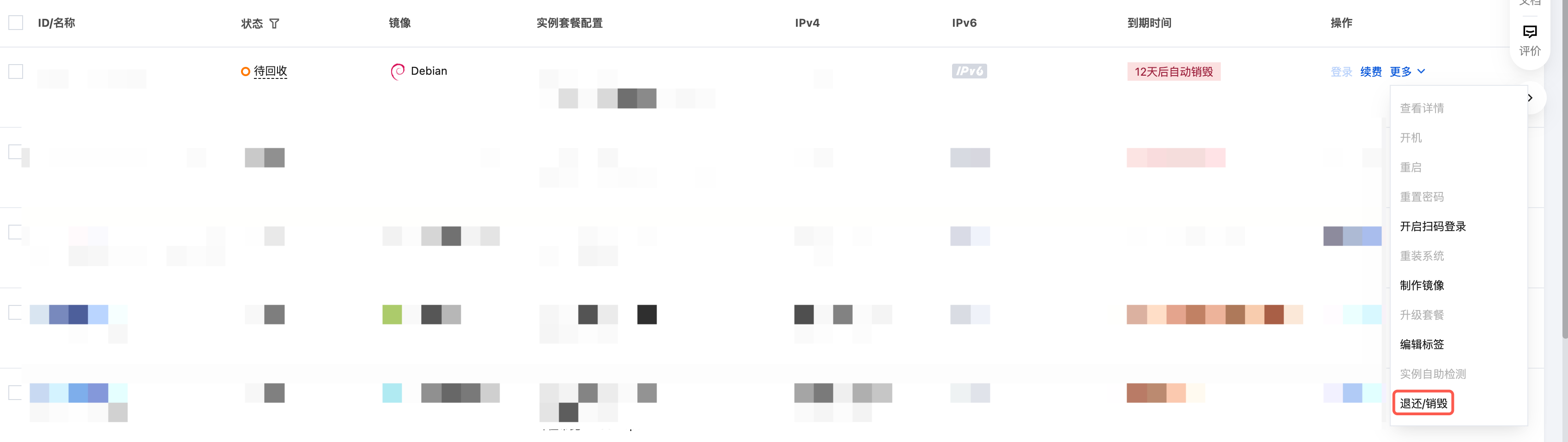 在列表视图中,找到待退还的轻量应用服务器,选择实例右侧的更多 > 退还/销毁。如下图所示:
