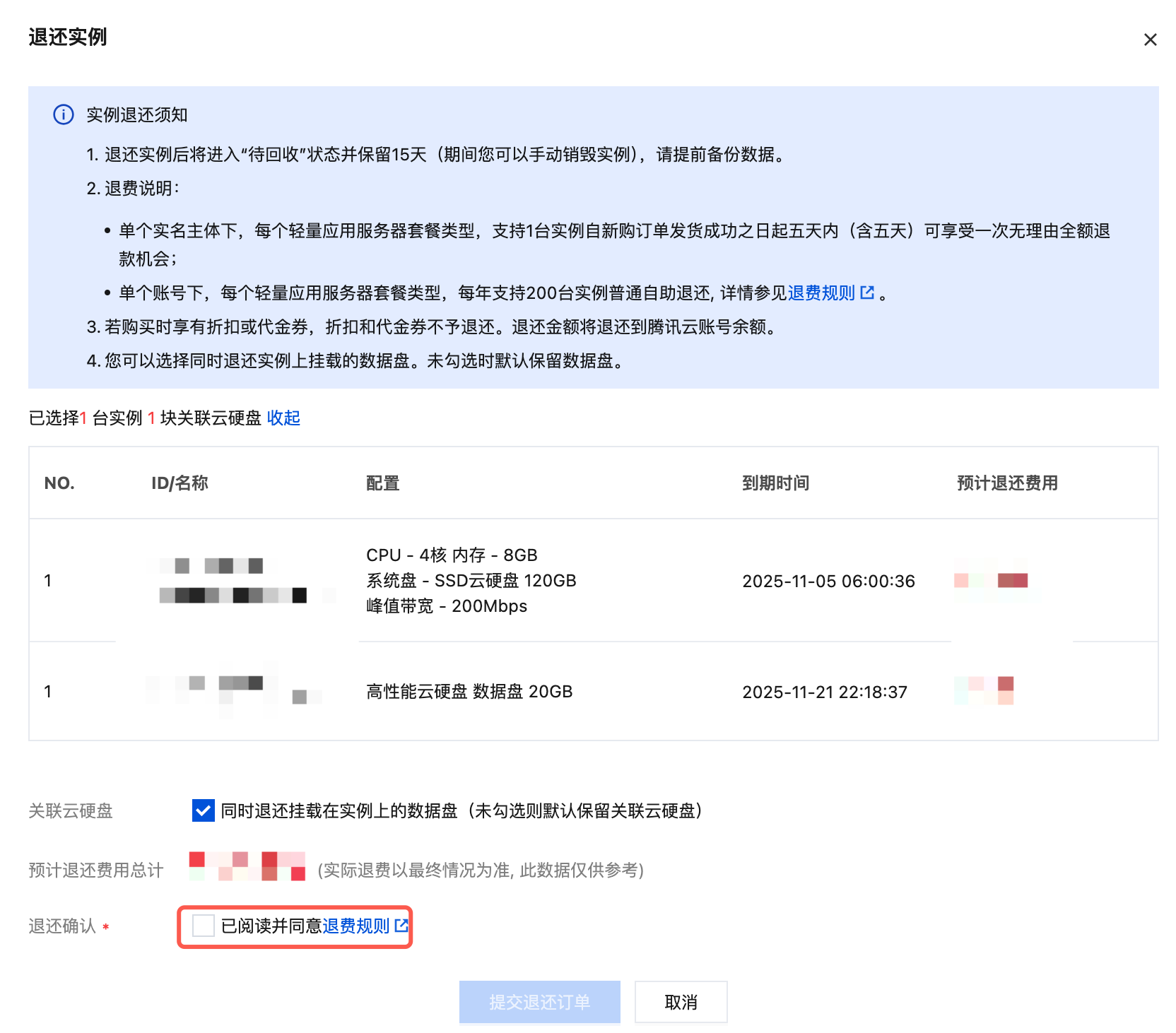 3. 在弹出的窗口中,若该实例未挂载数据盘,则可勾选已阅读并同意 退费规则,并单击提交退还订单,如下图所示: