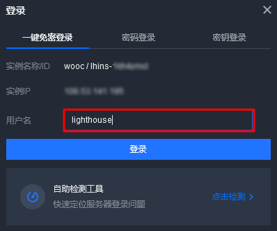 单击实例卡片进入服务器详情页,单击服务器登录中的免密登录,或页面右上角的登录。