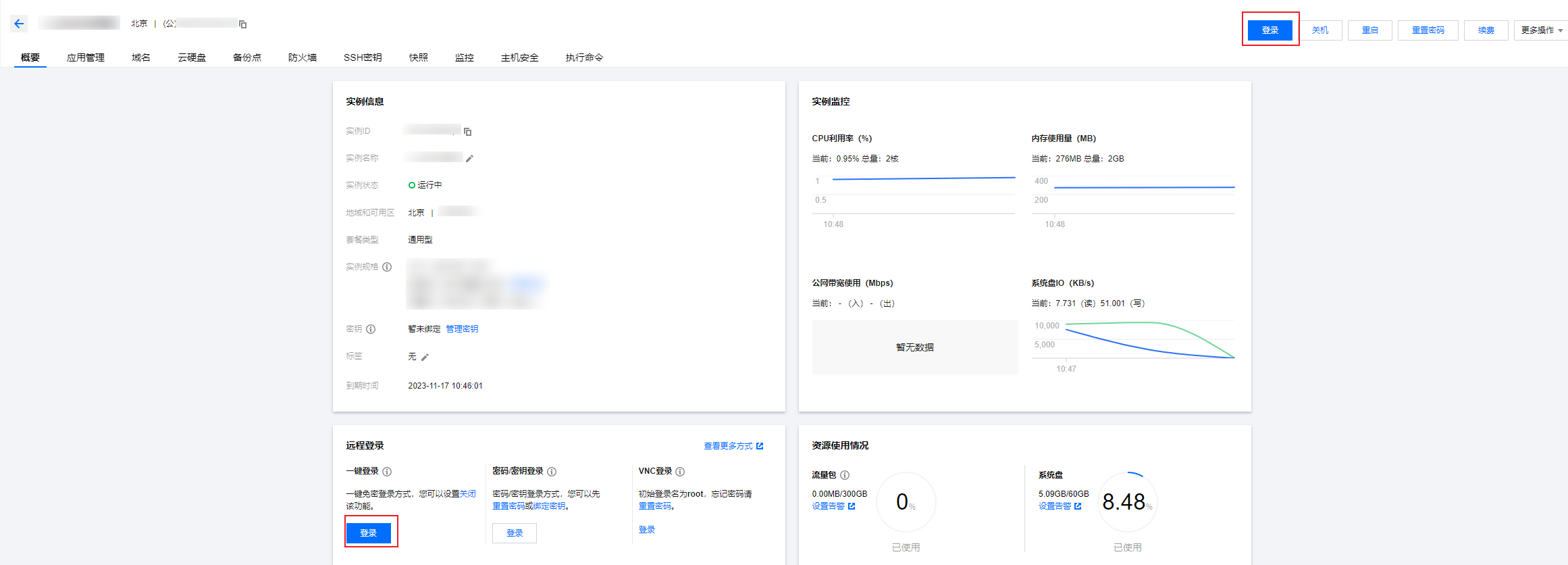 单击实例卡片进入服务器详情页,单击远程登录中的登录,或页面右上角的登录。