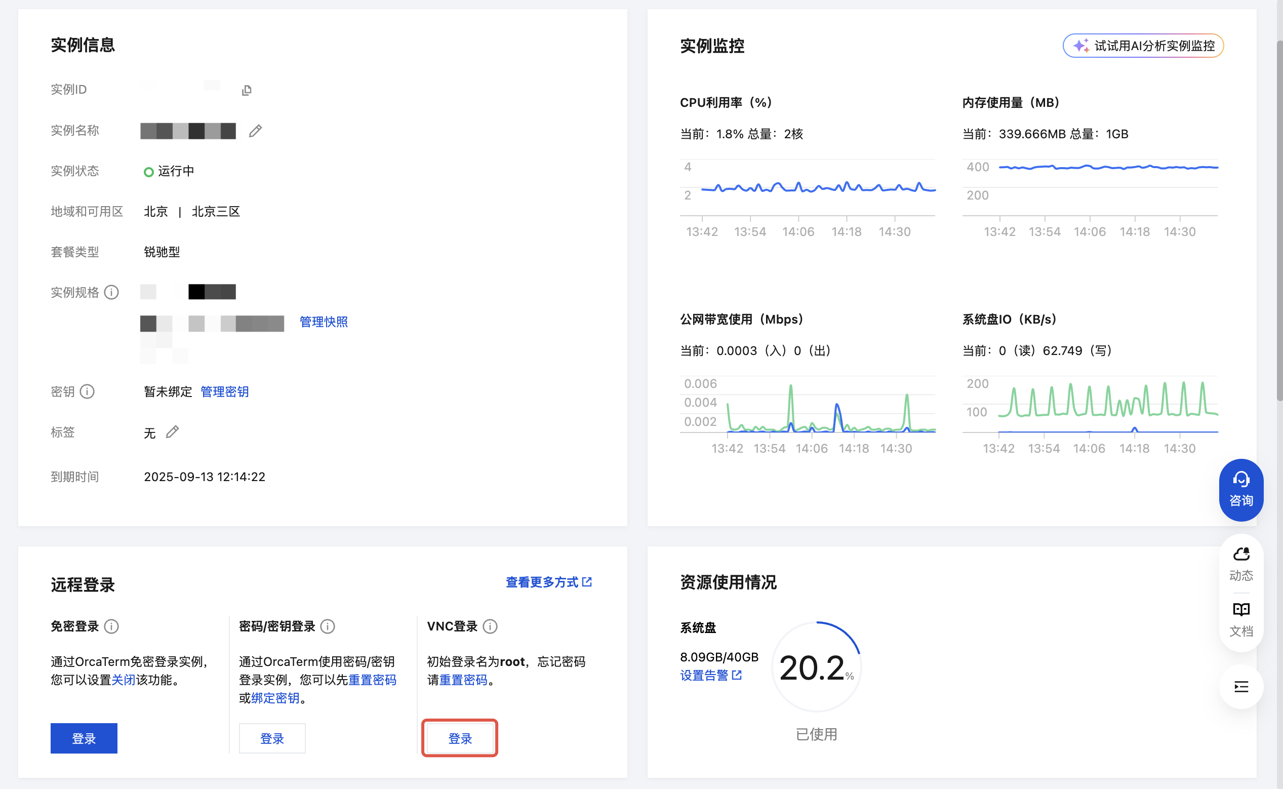 2. 在服务器列表中找到对应的实例,单击进入服务器详情页,选择概要页签,单击远程登录中VNC 登录下的登录。