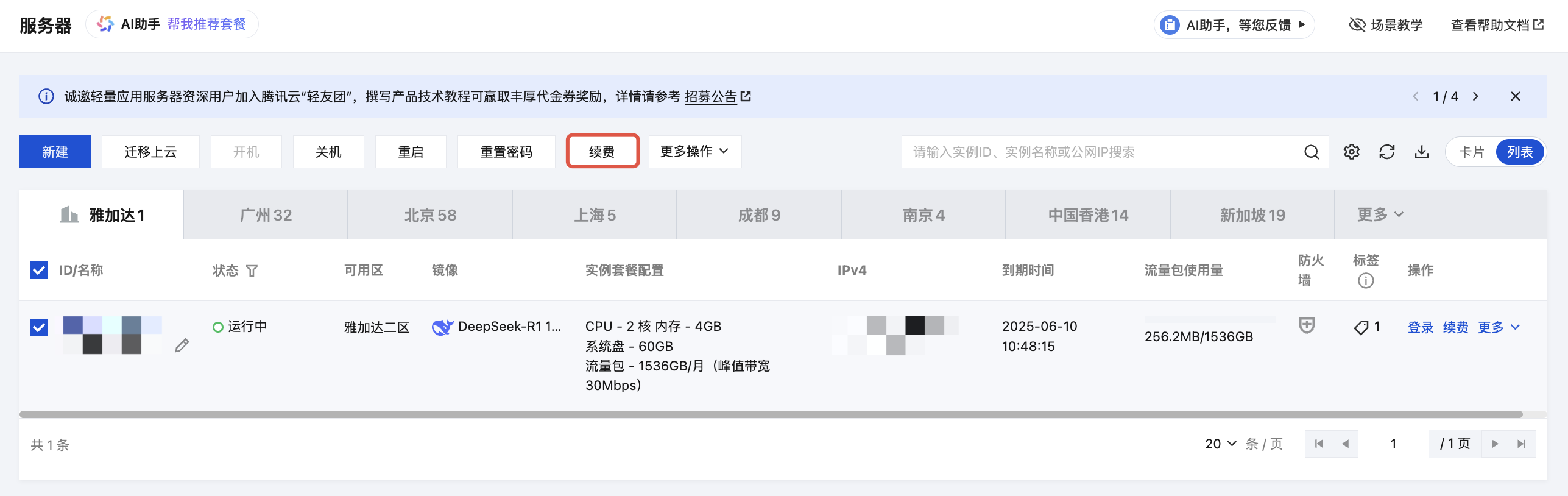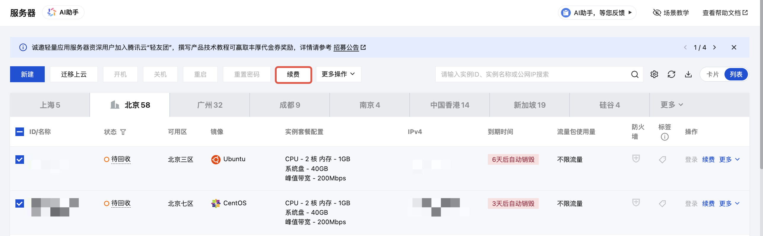 2. 在服务器实例列表中勾选需要续费的实例,单击续费。