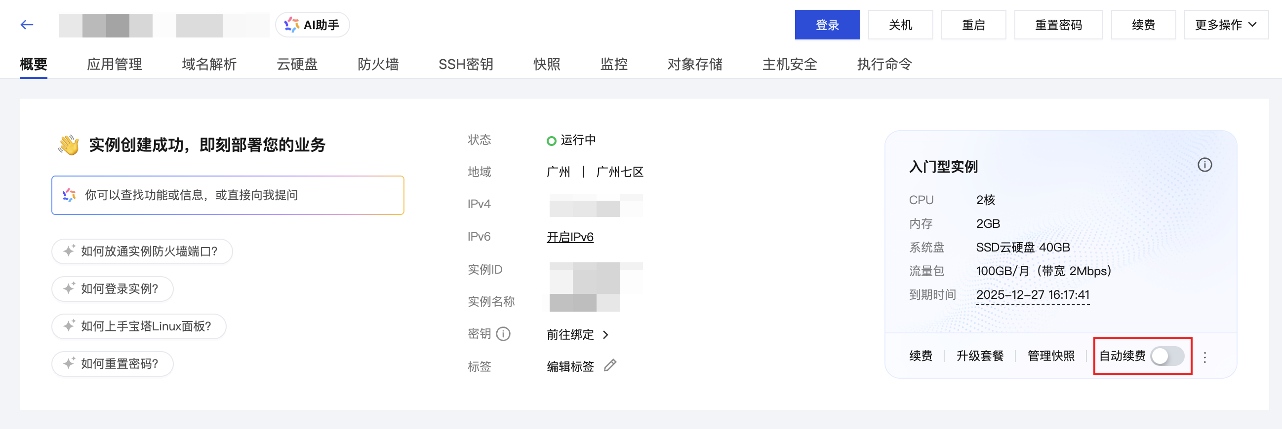 3. 在实例信息模块中,您可选择开启或关闭实例自动续费功能。如下图所示: