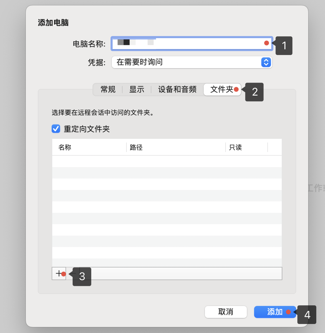 2. 在弹出的添加电脑窗口中,按以下步骤选择需上传的文件夹并创建连接。如下图所示: