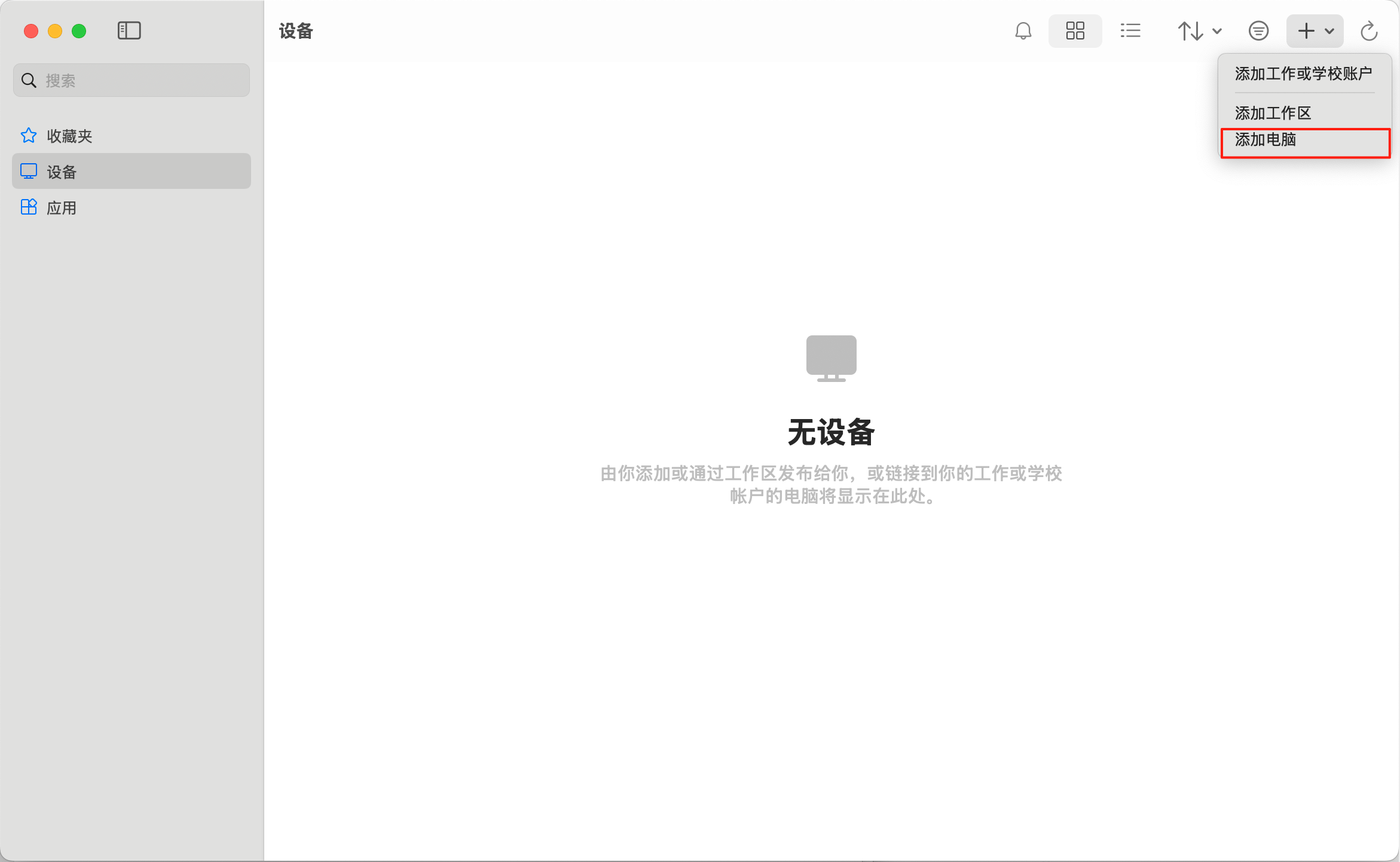 1. 启动 MRD,单击右上角加号,单击添加电脑。如下图所示: