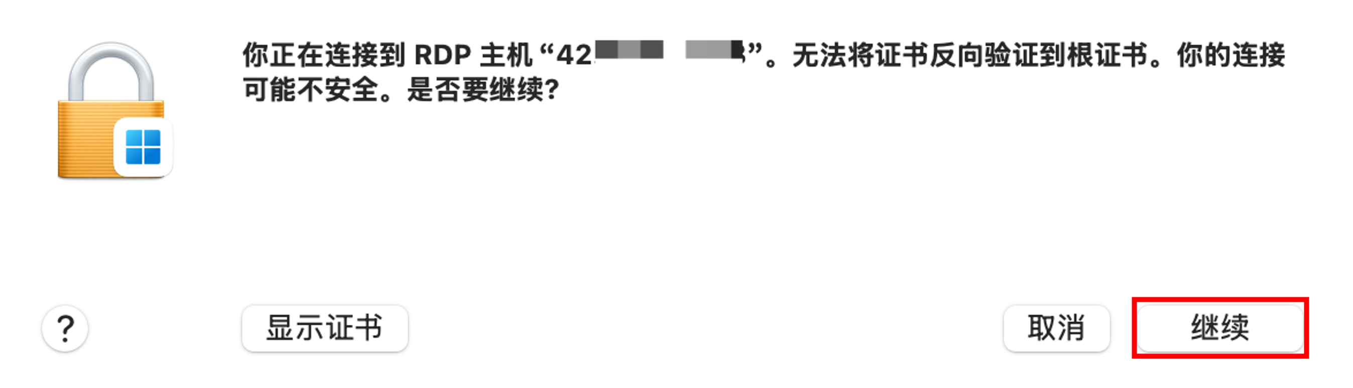 4. 在弹出的窗口中单击继续确认连接。如下图所示: