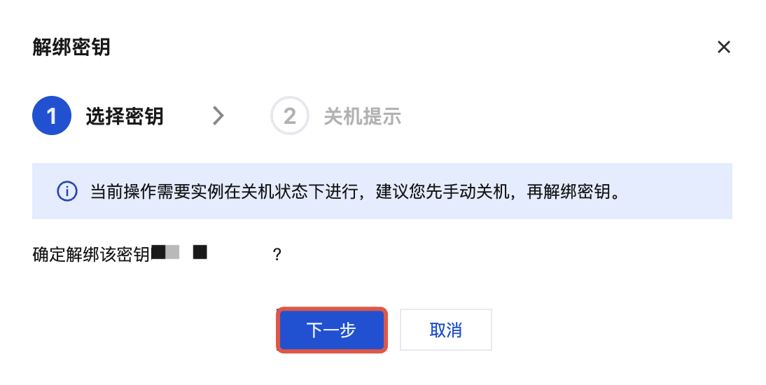 4. 在弹出的解绑密钥窗口中,根据实例状态进行操作: