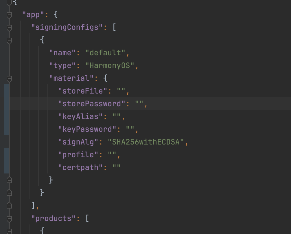 在工程下的 build-profile.json5 文件中,设置 signingConfigs。storeFile file 里填入您的 App 签名文件的路径(注意:该签名文件要与您在控制台申请密钥时用来获取哈希值的签名文件相一致),并填入对应的 storePassword、keyAlias 、keyPassword、signAlg、profile和 certpath 的值。