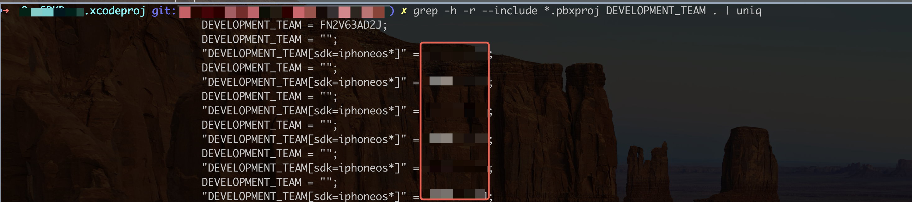 方法1:cd 到 项目 aaa.xcodeproj 文件同目录下,执行 grep -h -r --include *.pbxproj DEVELOPMENT_TEAM . | uniq