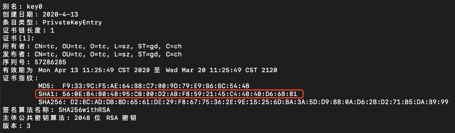 第一步:在终端输入下面命令:keytool -list -v -keystore <签名文件路径>