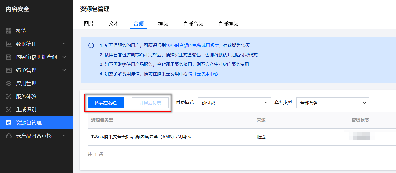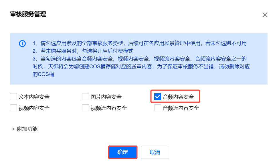 2. 选择音频内容安全服务,单击确定完成开通。