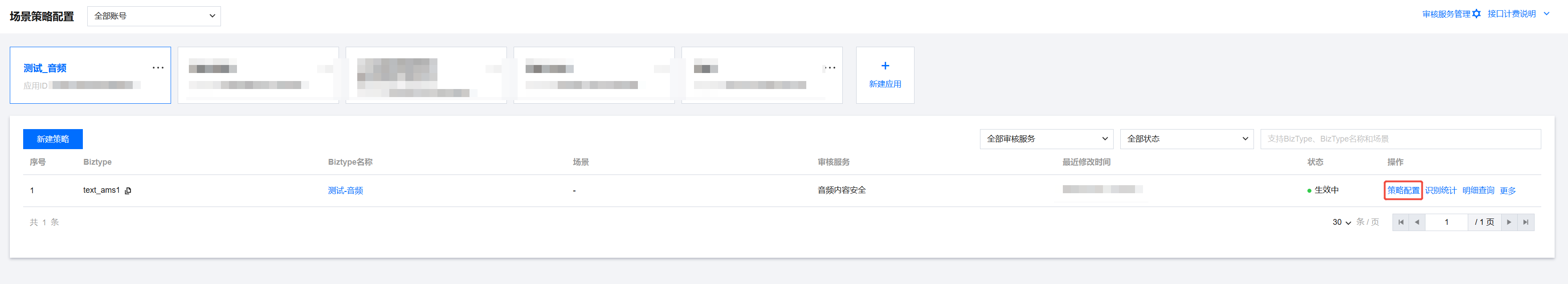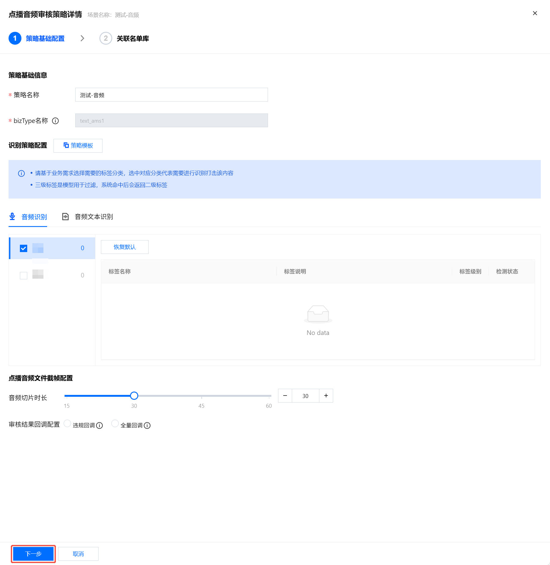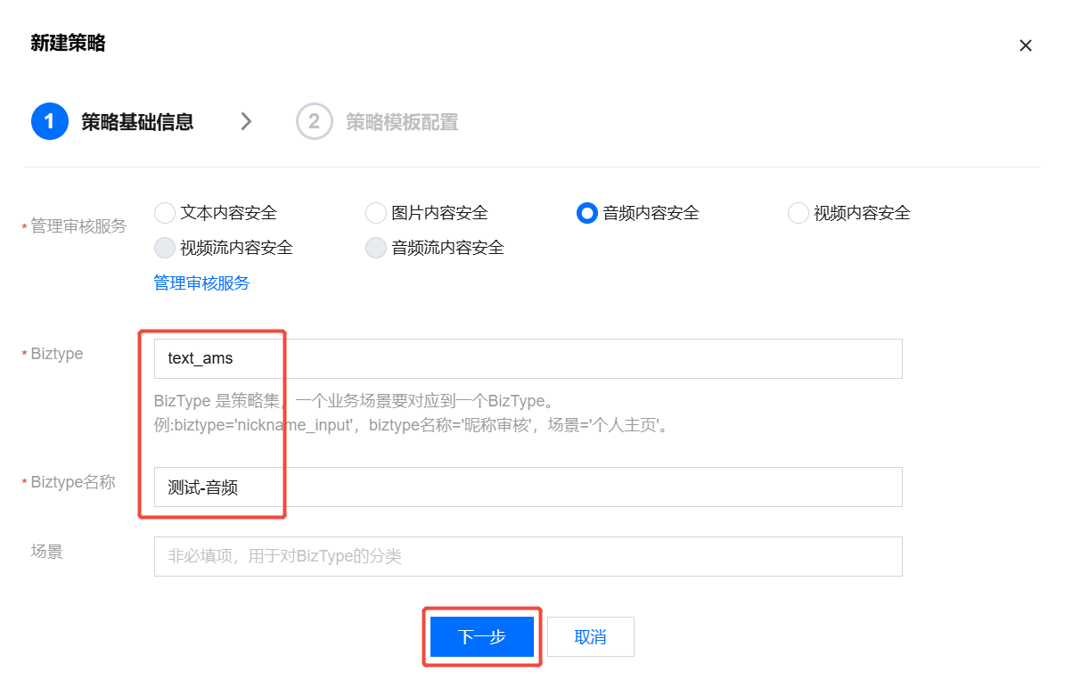 4. 在新建策略页面,选择音频内容安全,输入Biztype、Biztype名称、场景,单击下一步进入策略模板配置。