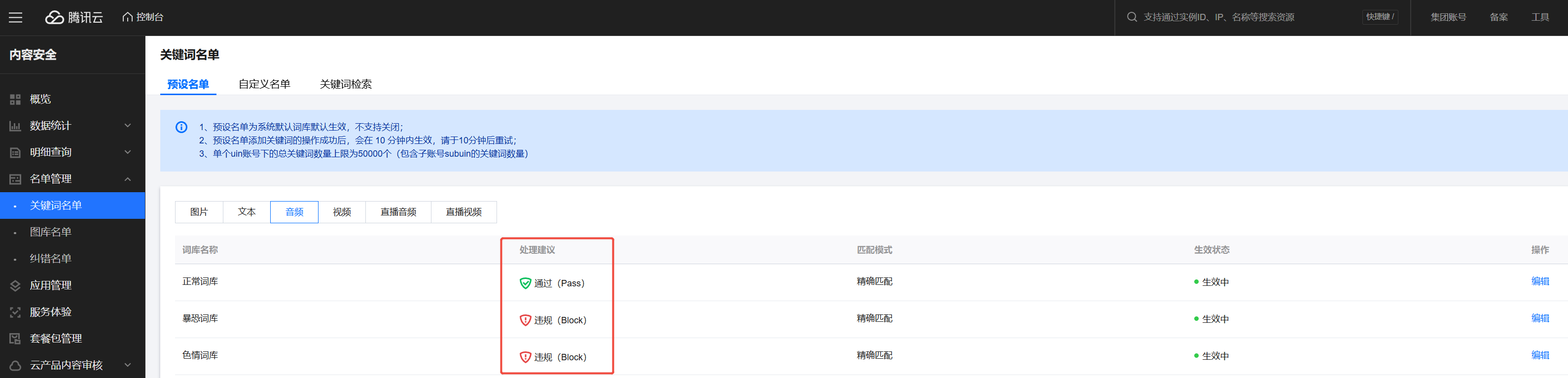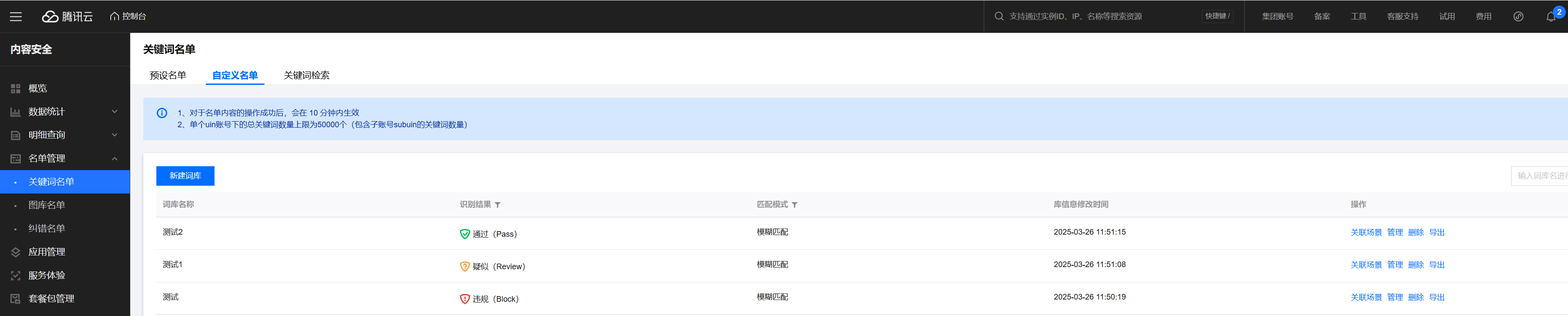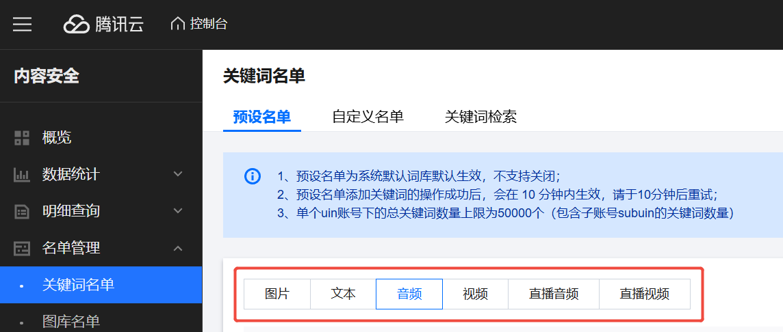 1. 登录 内容安全控制台,在左侧导航栏中,单击名单管理 > 关键词名单。