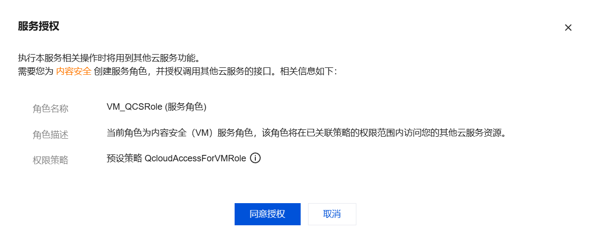 3. 在开通音频内容安全服务时,音频内容安全需要您为内容安全创建服务角色,并授权调用其他云服务接口,单击同意授权,完成身份校验后即可完成COS资源授权,正常使用或测试音频内容安全服务。