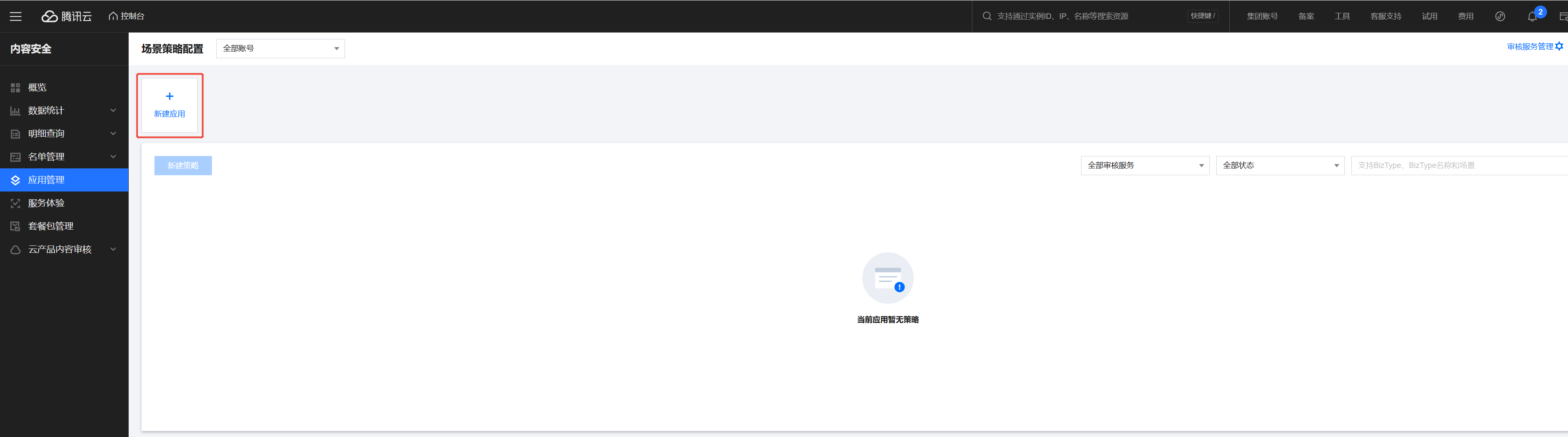 1. 登录 内容安全控制台,在概览页单击应用管理 > 新建应用,新建需要配置音频内容安全管理的应用。