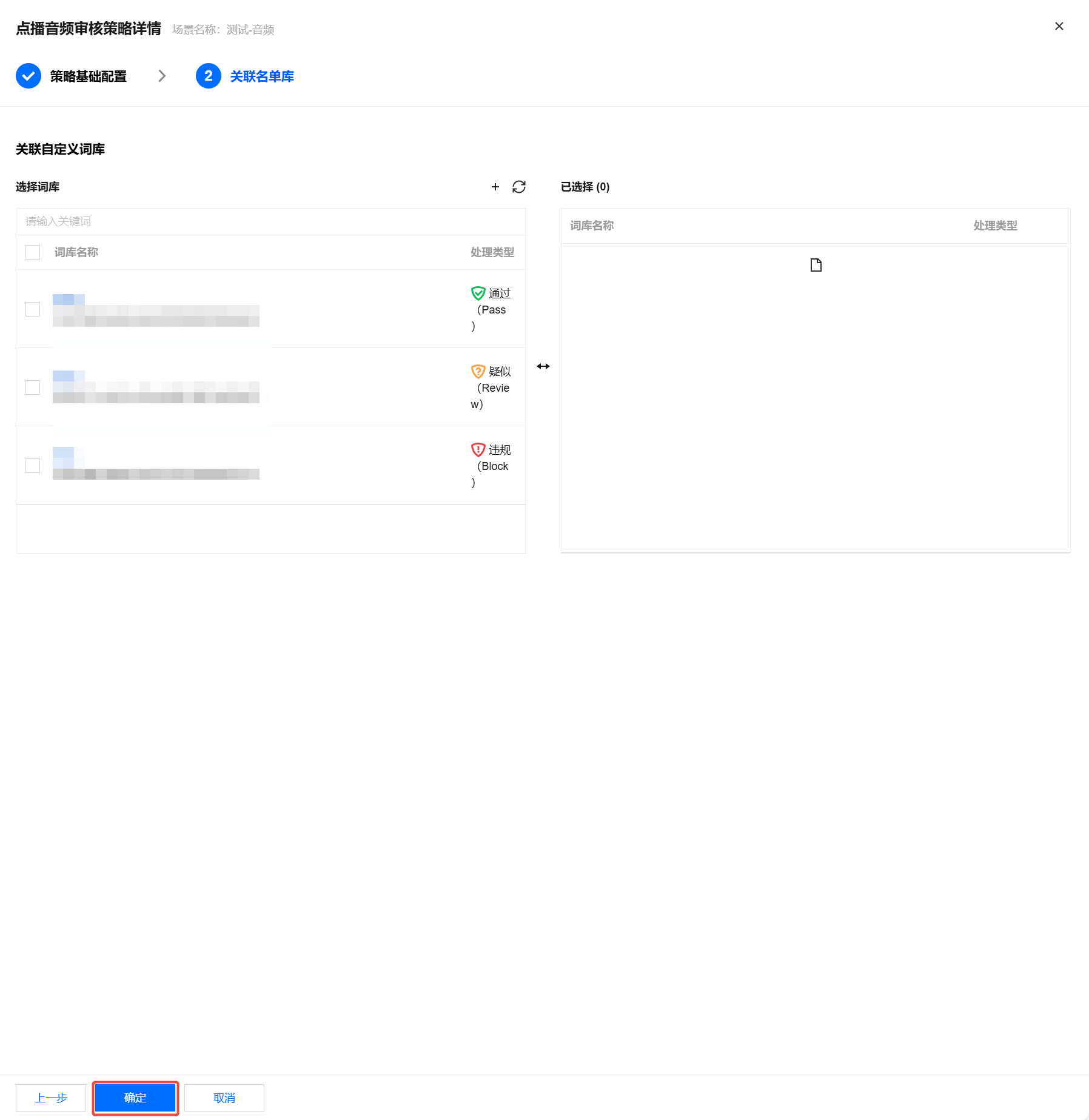 7. 完成识别策略配置后,单击下一步,选择是否需要关联名单库用于内容识别,如暂无关联名单库,可跳过,或保存当前策略后前往。