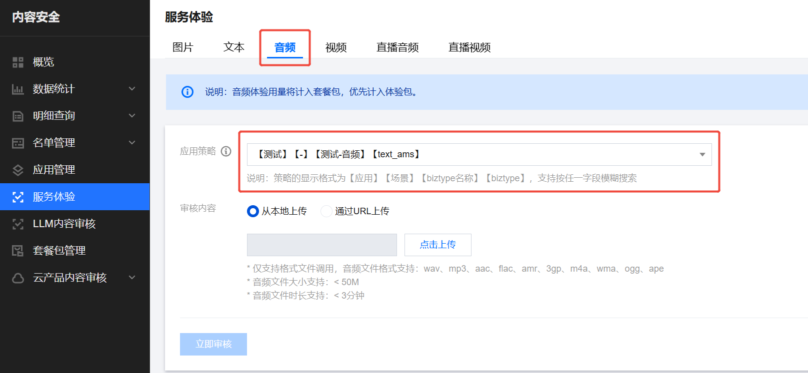 1. 登录 内容安全控制台,在左侧导航栏中,选择服务体验> 音频。
