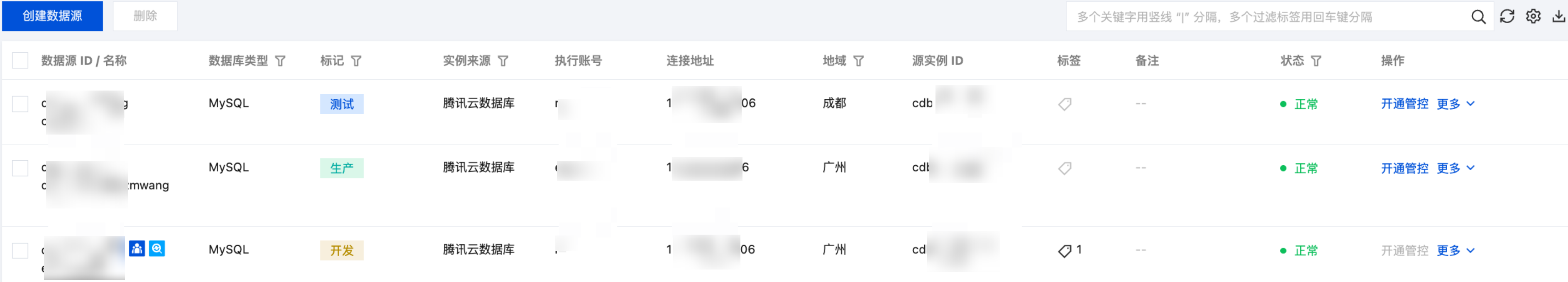 操作 | 对源实例开通管控:单击开通管控,具体操作请参见 数据源开通管控。 修改源实例的执行账号:单击更多 > 修改执行账号,具体操作请参见 修改执行账号。 修改数据源的标记:单击更多 > 修改标记,修改完标记后,单击确定。 删除数据源:单击更多 > 删除,具体操作请参见 删除数据源。 |