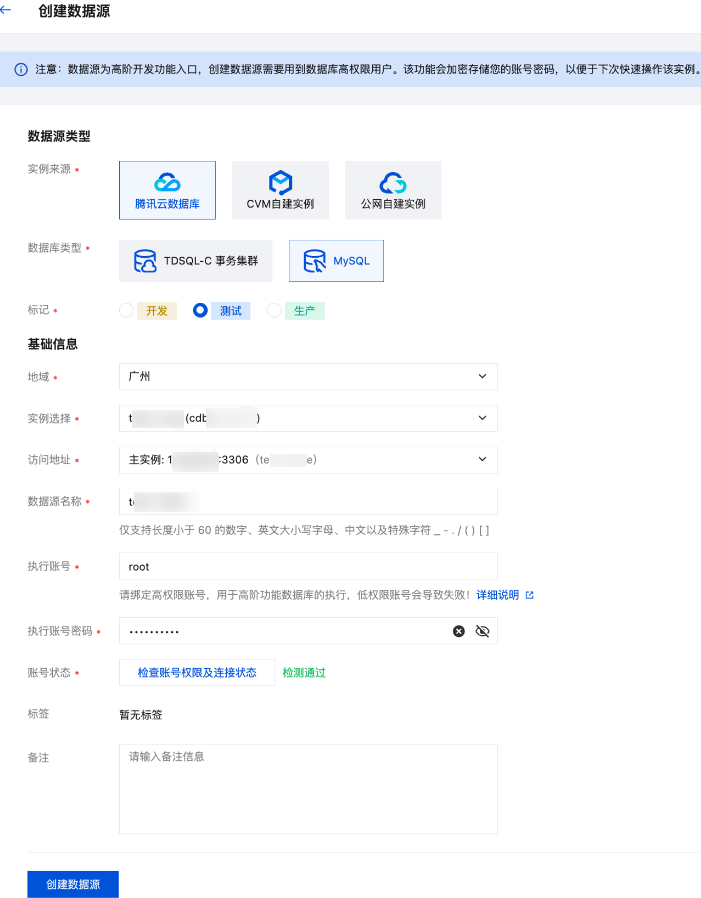 | 执行账号 | 请输入数据库实例的高权限账号,用于高阶功能数据库的执行,低权限账号检查账号权限及连接状态时会提示检测失败。 示例值:root | ✓ | ✓ | ✓ |