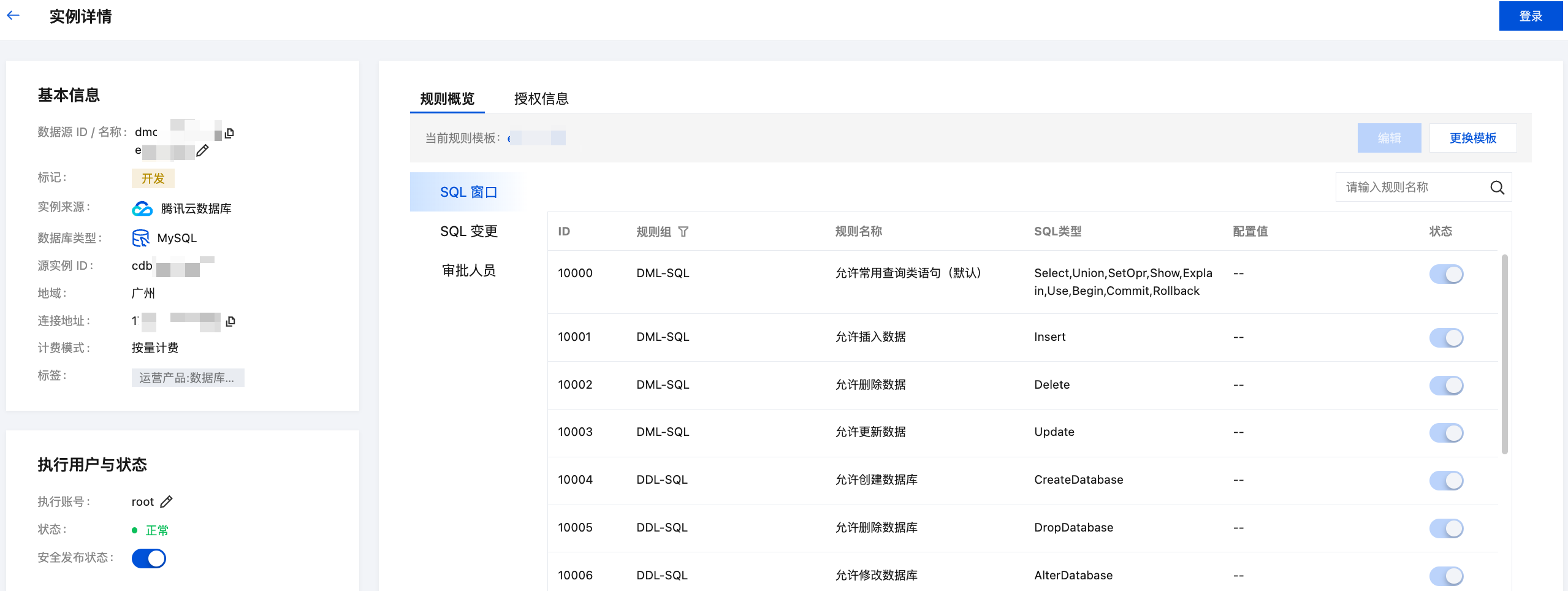 操作 | 查看管控实例详情:单击查看,进入实例详情页面,具体说明及操作请参见 查看管控实例详情。 安全发布登录 SQL 窗口:单击登录,即可进入 SQL 窗口页面。 修改实例执行账号:单击更多 > 修改执行账号,具体操作请参见 修改执行账号。 授权用户操作权限:单击更多 > 授权,具体操作请参见 授权用户操作权限。 申请库表操作权限:单击更多 > 申请权限,具体操作请参见 权限申请。 删除管控实例:单击更多 > 删除,单击确定,删除后该数据源将不在管控实例页面展示,数据源页面仍显示该实例且关闭管控,后续仍可根据需要开通管控。 |