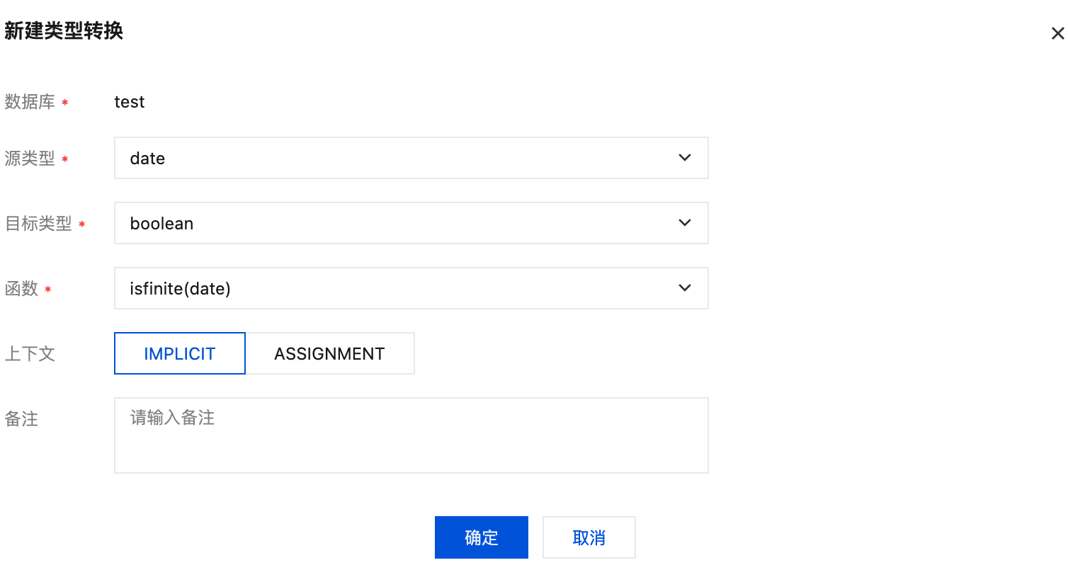上下文 | 否 | 定义转换发生的自动化程度。这是一个单选选项,决定了 PostgreSQL 在何种环境下可以自动调用此转换规则,而无需显式使用 CAST 语法。 IMPLICIT:隐式转换。优先级最高。在任何情况下,只要类型不匹配,PostgreSQL 都会自动尝试使用此转换。请谨慎使用,设置不当可能导致意外的隐式转换,使查询难以理解或产生非预期结果。 ASSIGNMENT:赋值转换。优先级次于 IMPLICIT。主要在向表的一列赋值时(如 INSERT 或 UPDATE)自动发生转换。这是最常用和最安全的选项。 |