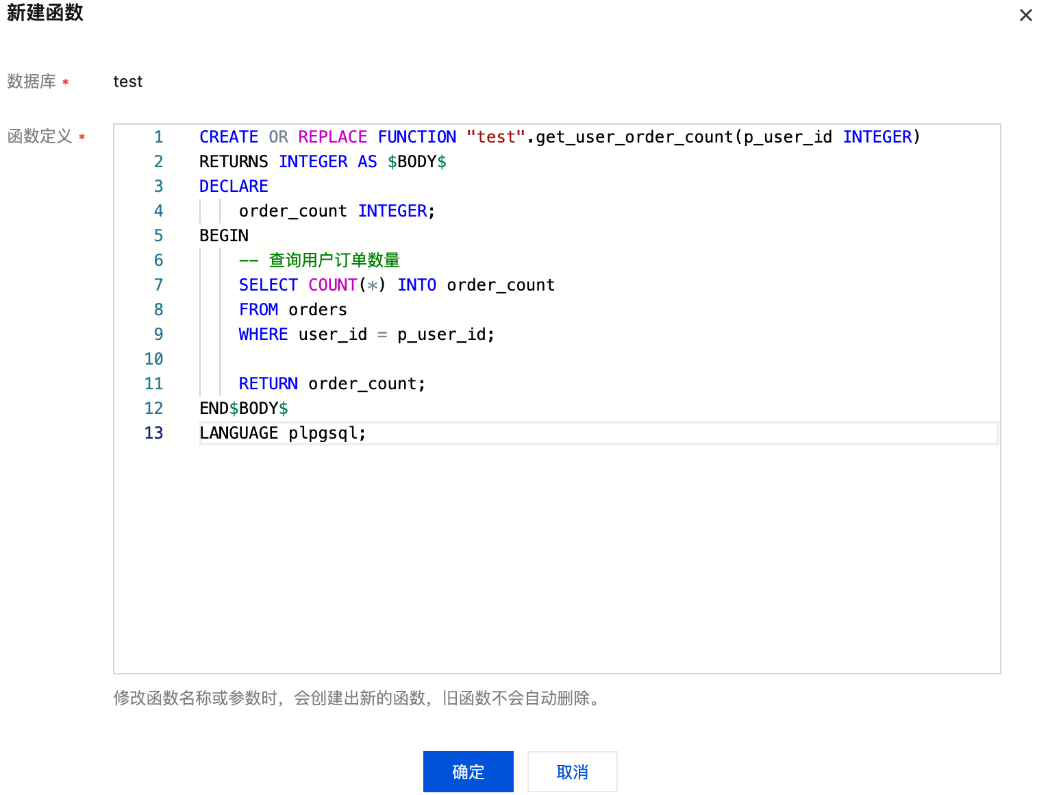 新建的函数将展示在左侧库表栏对应的数据库下方。