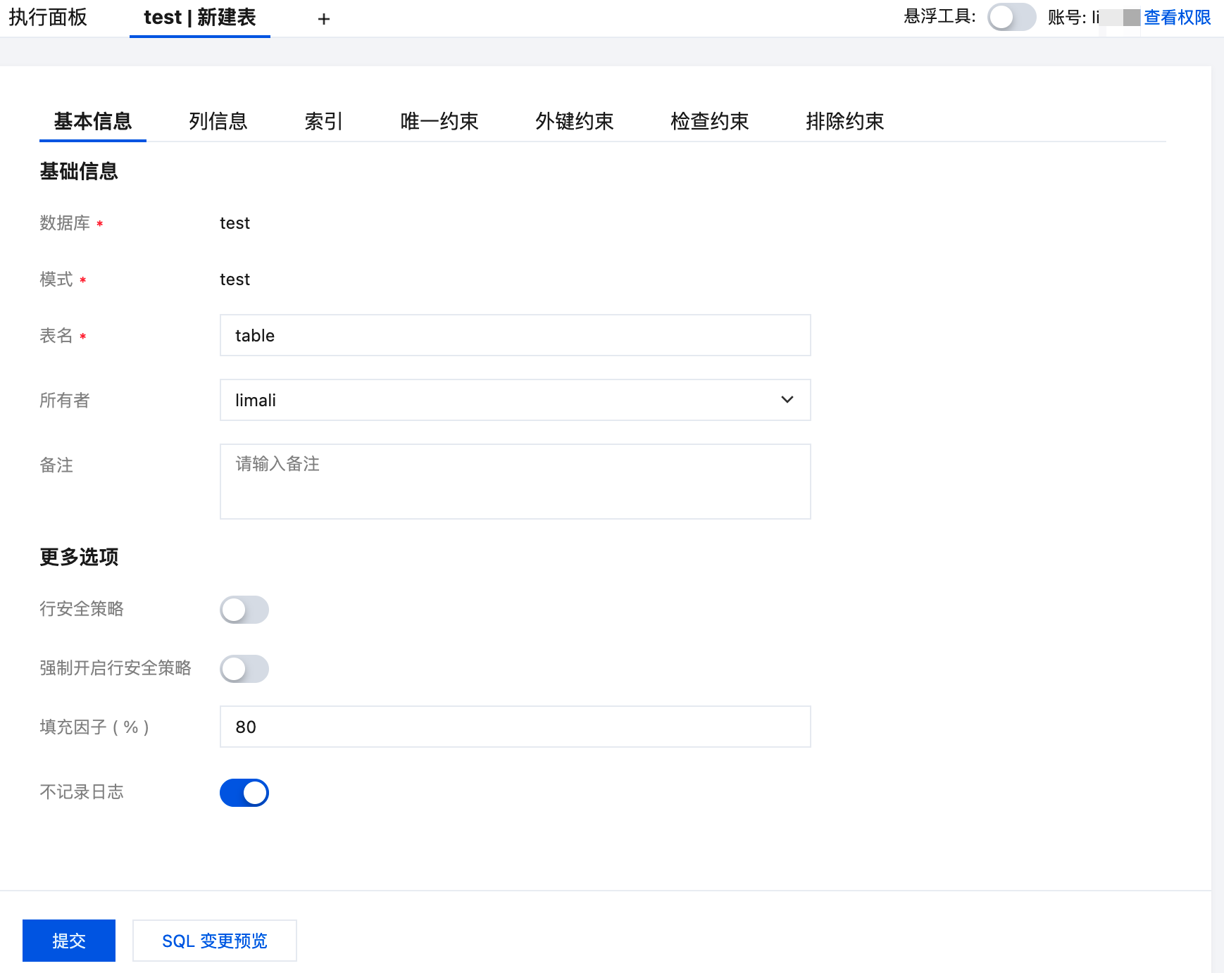 不记录日志 | 否 | 开关(默认关闭)。如果开启,对该表的操作不会记录到预写日志中。 优点:写入速度极快。 缺点:在数据库崩溃或故障后,该表的数据可能会丢失。 建议:仅用于临时中间表或可以丢失的数据,重要业务表务必保持关闭。 |