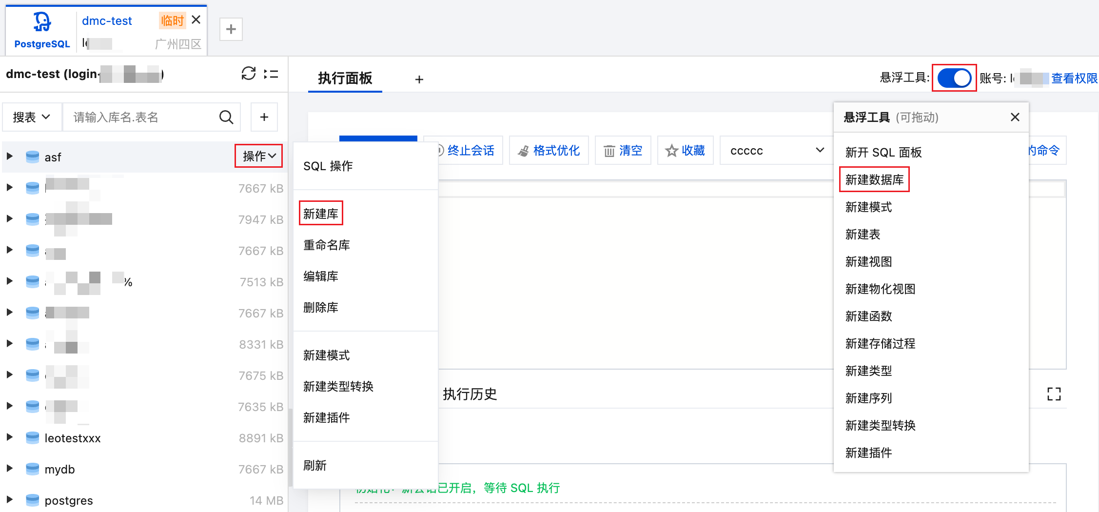 同时支持在页面右上方单击打开悬浮工具选择新建数据库或鼠标停至数据库名称处选择操作 > 新建库。