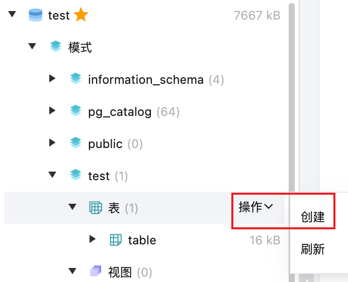 同时支持在左侧库表栏,鼠标悬停至表目录处,选择操作 > 创建。